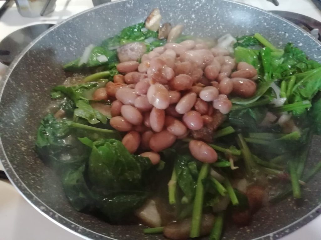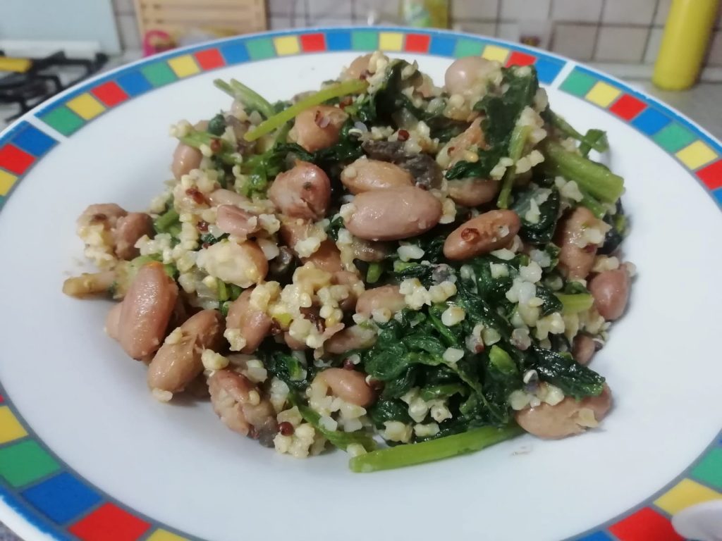 In una padella facciamo scaldare con un po’ di cipolla tritata degli spinaci freschi (vanno bene anche quelli congelati), dei funghi (quelli che preferite, sia freschi che congelati) e aspettate che siano diminuiti di volume. Aggiungete un po’ d’acqua se necessario. Quando i funghi e gli spinaci saranno cotti, unite i fagioli precedentemente cotti e amalgamate il tutto. A questo punto, aggiungete la quantità di miglio che desiderate e servite caldo.