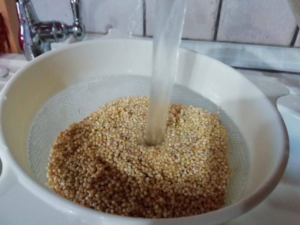 Per prima cosa il miglio che si trova in commercio per il consumo umano è del tipo decorticato. Prima di cuocerlo, è importante sciacquarlo sotto acqua corrente, per eliminare eventuali impurità. E’ importante che il miglio sia correttamente sciacquato in un colino a maglie strette e per capire se è pulito basta osservare l’acqua: quando diventa chiara, è pulito.