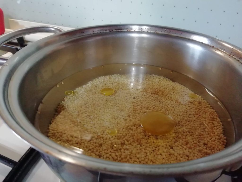 Poi, cuocere a fiamma bassa fin quando l’acqua non si sarà del tutto prosciugata. Spegnere la fiamma e lasciare raffreddare nella pentola. Assumerà l’aspetto granulare di un cous cous. Per questo, va sgranato di tanto in tanto con una forchetta.