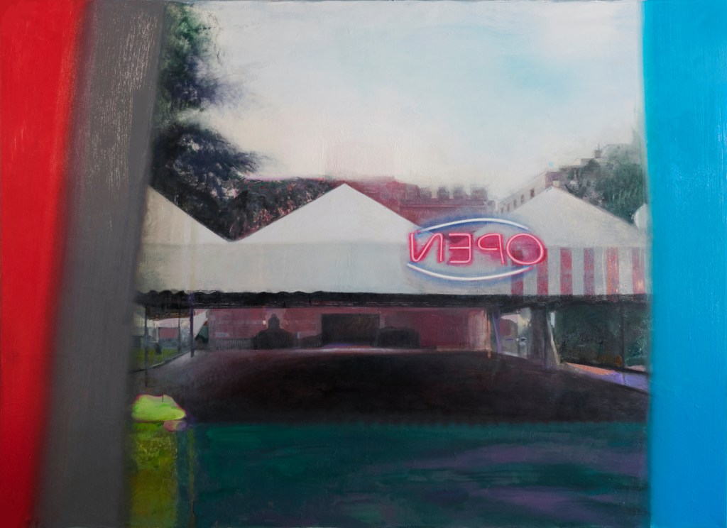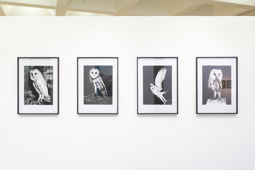 Classe 1980, nato a Ragusa ma residente a Modica, Giovanni Blanco mette in mostra nove opere portate a termine tra il 2014 e il 2022. Tra queste due piccole opere su carta, grandi come un foglio da lettera, intitolate La scatola del pittore, si incaricano di fare sintesi della singolare postazione di un artista. Alto valore simbolico hanno invece i dipinti iperrealistici la Scimmia pittore e Senza titolo, autoritratti metaforici che cercano di far riflettere sulla condizione dell’artista, e dove coesistono in equilibrio il monocromatico e la presenza vivida della tavolozza del pittore. Nella serie Monotipi (inchiostro calcografico su carta), raffiguranti rapaci notturni, nello specifico barbagianni sorpresi da un flash notturno, l’artista sembra invece tracciare una riflessione sulla luce e sulla dimensione della fotografia. Infine appare come un fotogramma sbagliato, tagliato lateralmente da bande cromatiche incongrue, la grande opera Open che, realizzata appositamente per questa esposizione e raffigurante un padiglione fieristico in disuso presso Porta Galliera a Bologna, con la sua mancata inquadratura ci dà l’impressione di essere di fronte ad una diapositiva rovesciata.