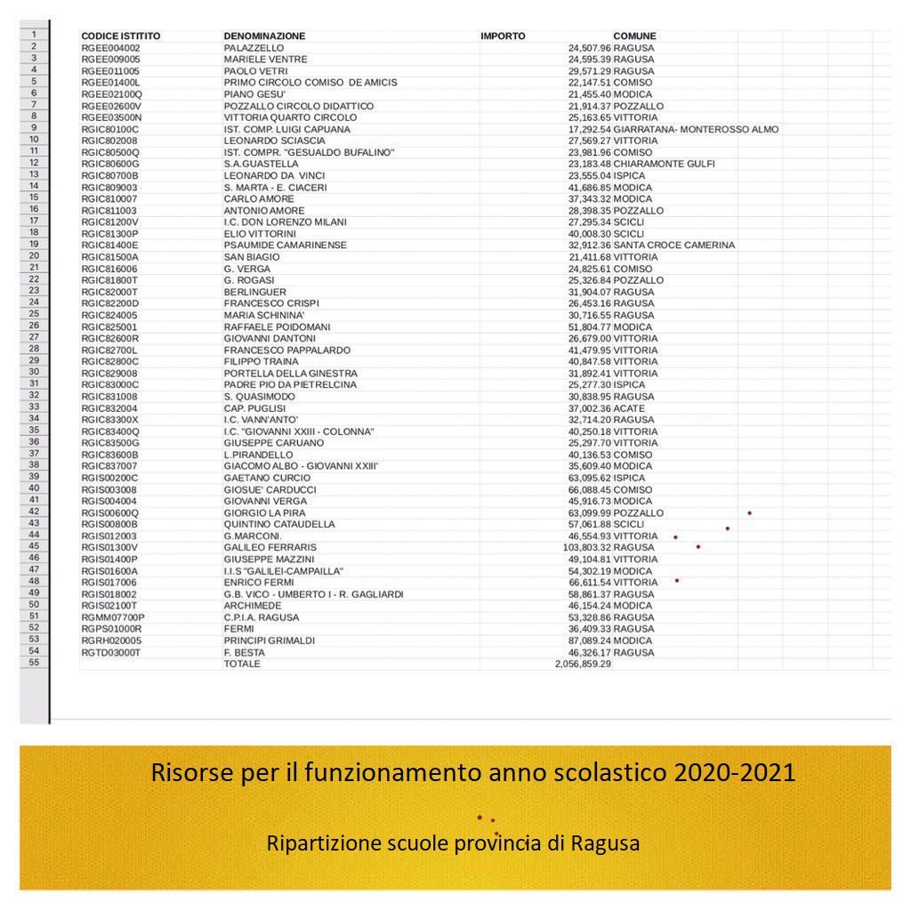 Il Decreto Rilancio prevede, poi -prosegue la presidente Lorefice-, 31.471.433 euro per la Sicilia, di cui 2.056.859 destinati a 53 istituti in provincia di Ragusa (vedi tabella allegata), per sostenere e contribuire alla ripresa dell’attività scolastica in presenza in condizioni di sicurezza, dopo il periodo di sospensione delle attività in classe dovuto al contenimento della pandemia da Coronavirus. Siamo consapevoli che i nostri insegnanti e studenti hanno dovuto superare molte difficoltà in questi mesi per far sì che i programmi scolastici venissero svolti con regolarità.