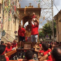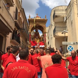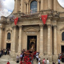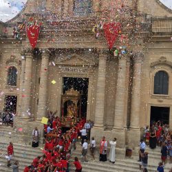 Colori a tempesta. E un grido assordante che esce dal cuore e che sovrasta fedeli e devoti: “Iautu u Patronu”. Nel frattempo un’onda umana si muove come se fosseanimata da un’unica persona. Braccia tese allo spasimo. Per reggere il simulacro. Un battito di ciglia e le ripide scalinate della basilica sono affrontate come se nulla fosse. Momenti suggestivi, emozionanti, carichi di devozione e allo stesso tempo straordinari per chi è curioso di ammirare il folklore che deriva dalla storia. Roba da rimanere a bocca aperta. Tutto questo, e molto altro ancora, ha animato la tradizionale “Sciuta” di San Bartolomeo Apostolo che, come ogni anno, si è consumata quest’oggi, 24 agosto, a Giarratana. Stavolta qualche minuto dopo mezzogiorno, una folla di persone, in numero ancora più consistente rispetto allo scorso anno, ha applaudito l’evento più atteso. Il simulacro del Patrono, spinto da una selva di mani, è venuto giù, è proprio il caso di dirlo, dopo l’uscita dalla chiesa di San Bartolomeo con un fragore di mortaretti e un diluvio di “nzaireddi”, le caratteristiche strisce in carta di vari colori, con il rosso a predominare. Poi, più volte, lo stesso simulacro ha reso onore al tempio che lo ospita tutto l’anno con l’andatura caratteristica dell’avanti e indietro: il tutto prima di dare il via alla processione. Per qualche minuto tutta Giarratana si è fermata e si è concentrata dinanzi all’edificio di culto che ospita il Patrono. La “Sciuta” è la tradizione religiosa che meglio raffigura il carattere forte e determinato dei residenti della Perla degli Iblei. Ad anticipare il momento dell’uscita, il rullare dei tamburi Città di Giarratana. Poi, l’apoteosi. La tradizionale “Sciuta” è stata salutata da manifestazioni di giubilo. Quindi, la processione ha preso il via seguendo il tradizionale percorso cittadino caratterizzato, tra l’altro, dalla visita alla chiesa di Sant’Antonio Abate. Tra gli altri momenti significativi la tradizionale foto di gruppo di tutti i portatori con il parroco e il vicario. In più anche ai nuovi nati è stata fornita la possibilità di rendere onore al Patrono in una maniera assolutamente suggestiva.