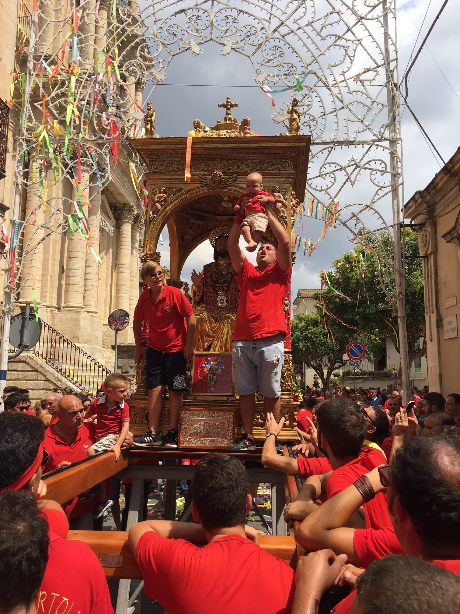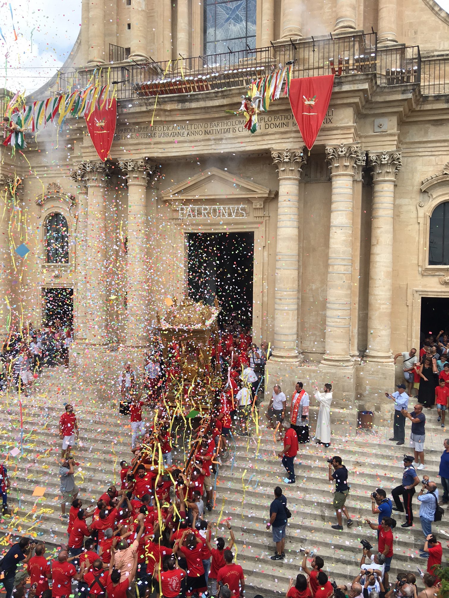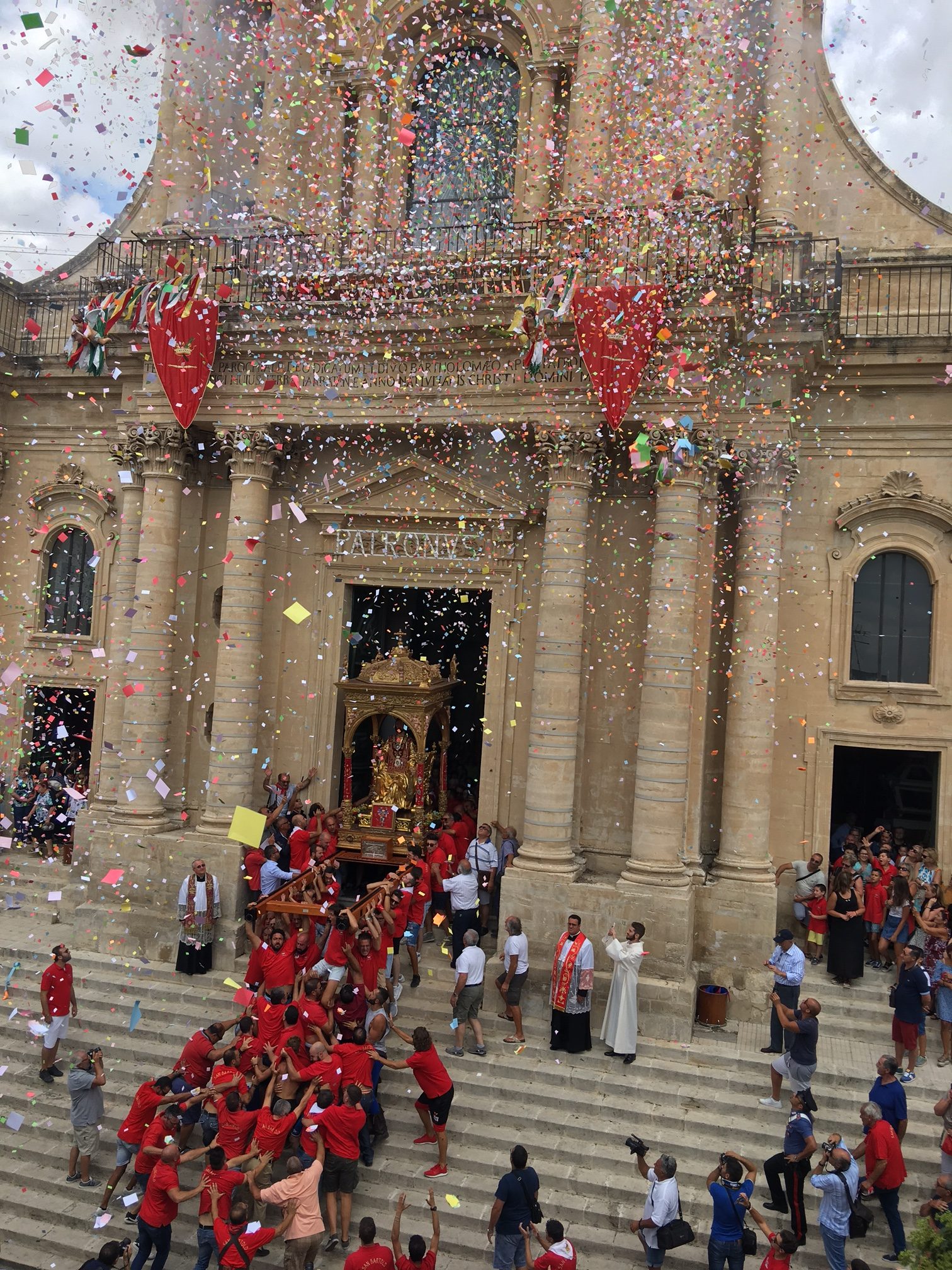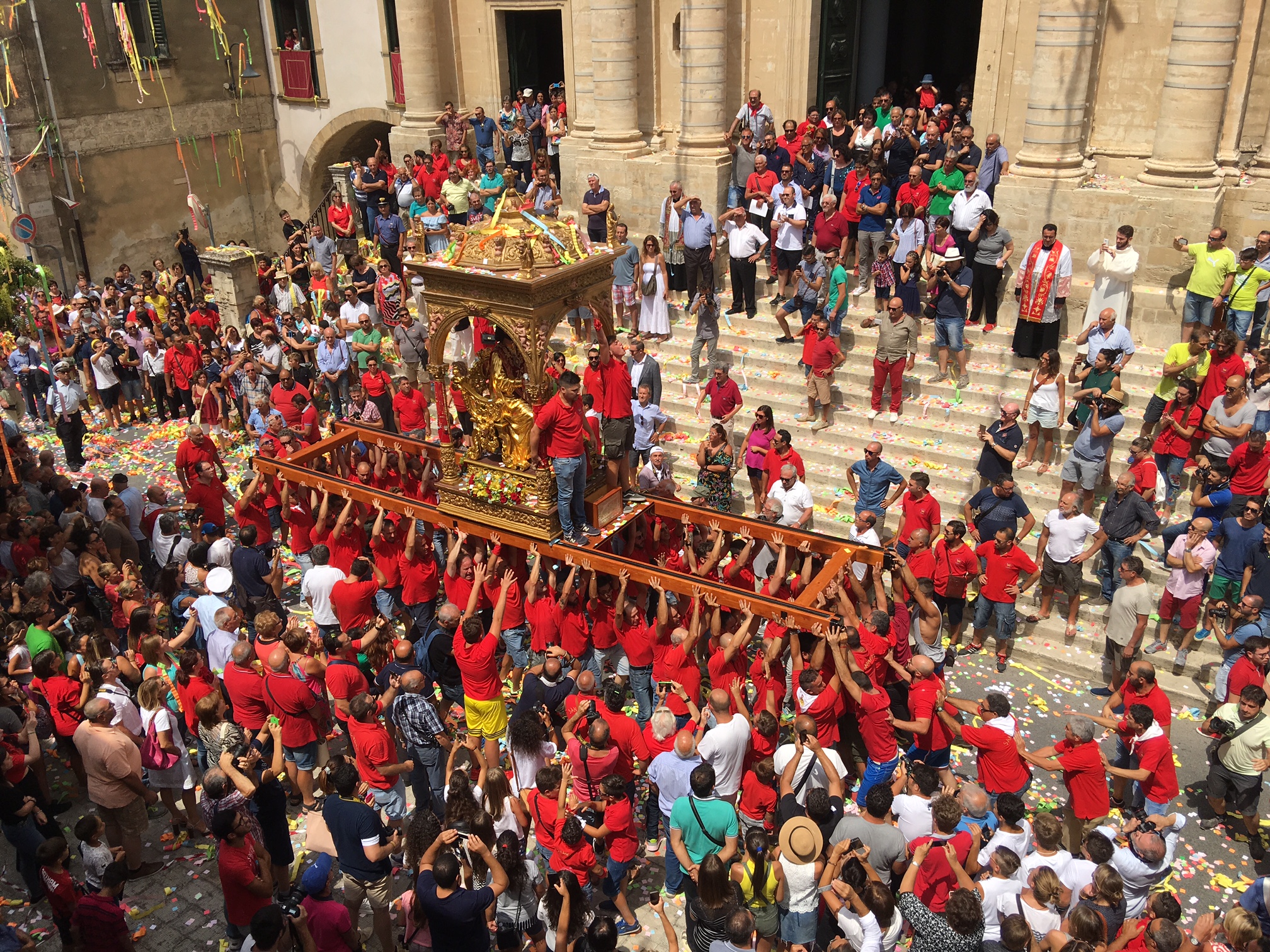 Colori a tempesta. E un grido assordante che esce dal cuore e che sovrasta fedeli e devoti: “Iautu u Patronu”. Nel frattempo un’onda umana si muove come se fosseanimata da un’unica persona. Braccia tese allo spasimo. Per reggere il simulacro. Un battito di ciglia e le ripide scalinate della basilica sono affrontate come se nulla fosse. Momenti suggestivi, emozionanti, carichi di devozione e allo stesso tempo straordinari per chi è curioso di ammirare il folklore che deriva dalla storia. Roba da rimanere a bocca aperta. Tutto questo, e molto altro ancora, ha animato la tradizionale “Sciuta” di San Bartolomeo Apostolo che, come ogni anno, si è consumata quest’oggi, 24 agosto, a Giarratana. Stavolta qualche minuto dopo mezzogiorno, una folla di persone, in numero ancora più consistente rispetto allo scorso anno, ha applaudito l’evento più atteso. Il simulacro del Patrono, spinto da una selva di mani, è venuto giù, è proprio il caso di dirlo, dopo l’uscita dalla chiesa di San Bartolomeo con un fragore di mortaretti e un diluvio di “nzaireddi”, le caratteristiche strisce in carta di vari colori, con il rosso a predominare. Poi, più volte, lo stesso simulacro ha reso onore al tempio che lo ospita tutto l’anno con l’andatura caratteristica dell’avanti e indietro: il tutto prima di dare il via alla processione. Per qualche minuto tutta Giarratana si è fermata e si è concentrata dinanzi all’edificio di culto che ospita il Patrono. La “Sciuta” è la tradizione religiosa che meglio raffigura il carattere forte e determinato dei residenti della Perla degli Iblei. Ad anticipare il momento dell’uscita, il rullare dei tamburi Città di Giarratana. Poi, l’apoteosi. La tradizionale “Sciuta” è stata salutata da manifestazioni di giubilo. Quindi, la processione ha preso il via seguendo il tradizionale percorso cittadino caratterizzato, tra l’altro, dalla visita alla chiesa di Sant’Antonio Abate. Tra gli altri momenti significativi la tradizionale foto di gruppo di tutti i portatori con il parroco e il vicario. In più anche ai nuovi nati è stata fornita la possibilità di rendere onore al Patrono in una maniera assolutamente suggestiva.