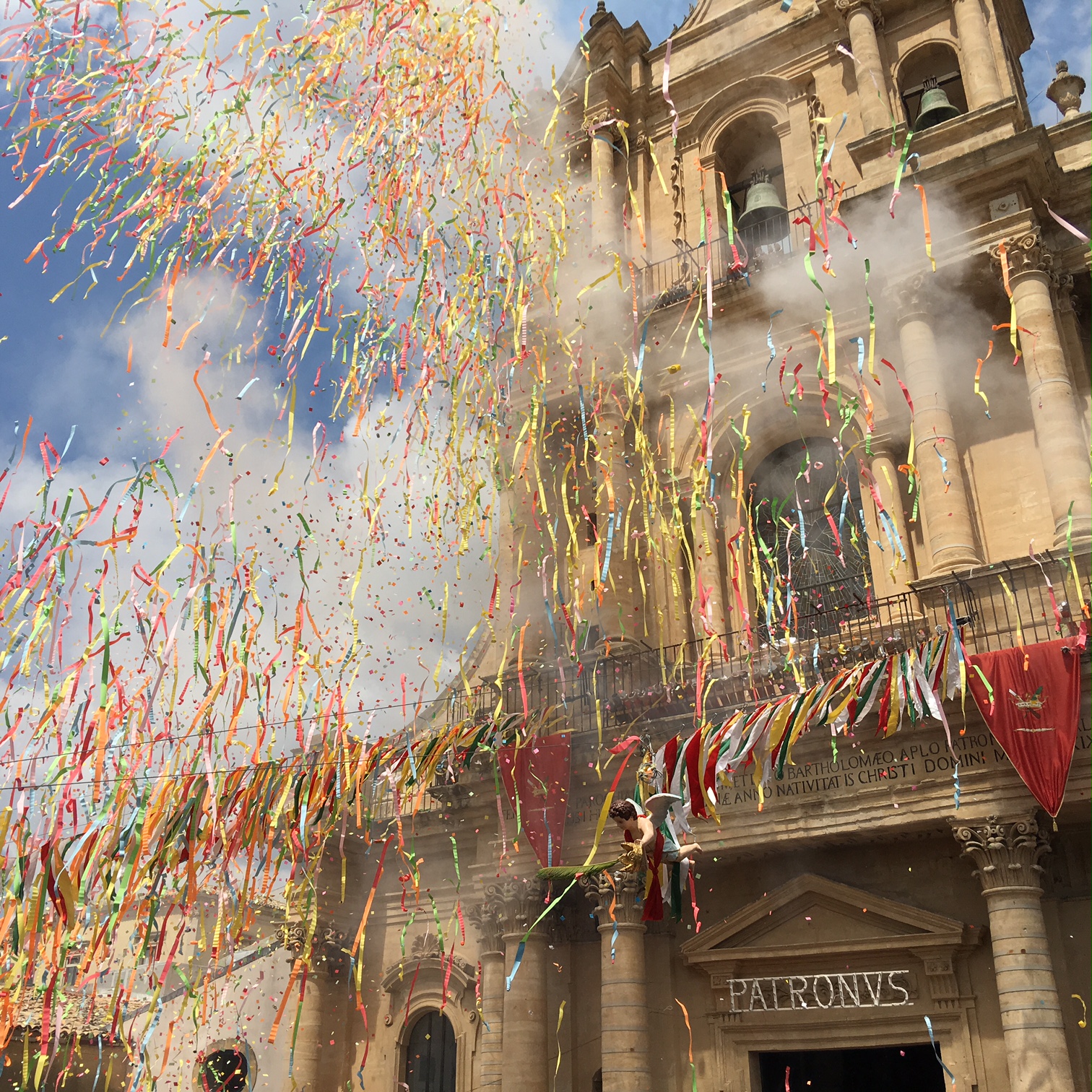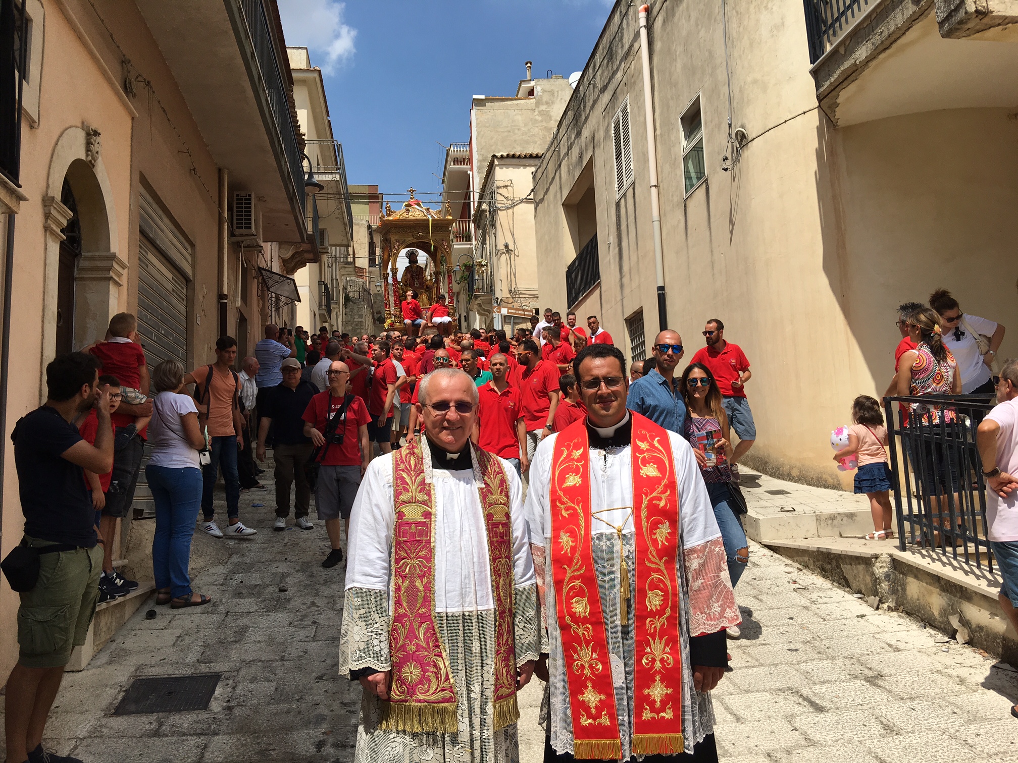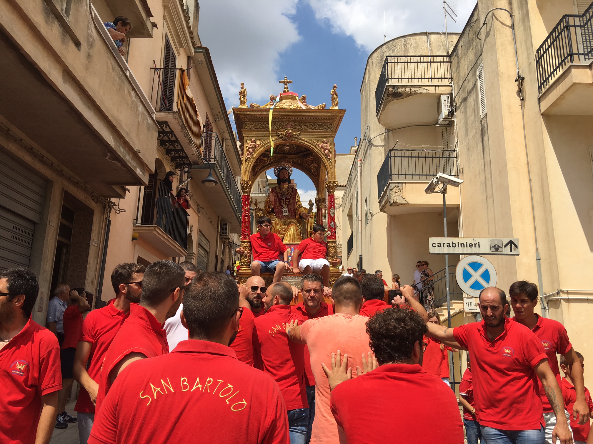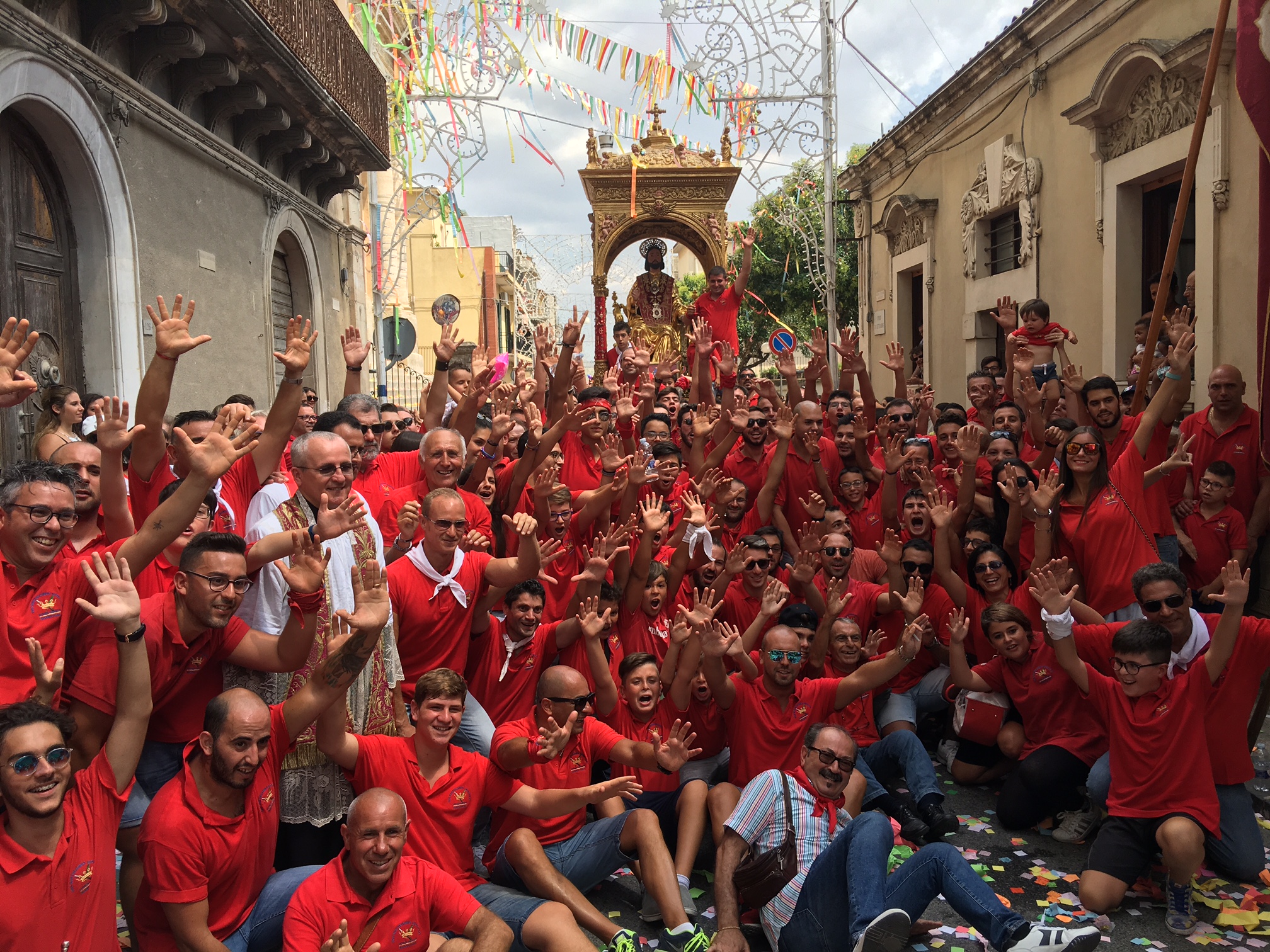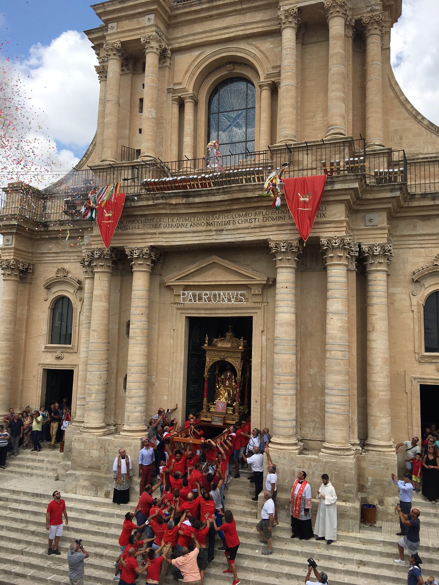 Colori a tempesta. E un grido assordante che esce dal cuore e che sovrasta fedeli e devoti: “Iautu u Patronu”. Nel frattempo un’onda umana si muove come se fosseanimata da un’unica persona. Braccia tese allo spasimo. Per reggere il simulacro. Un battito di ciglia e le ripide scalinate della basilica sono affrontate come se nulla fosse. Momenti suggestivi, emozionanti, carichi di devozione e allo stesso tempo straordinari per chi è curioso di ammirare il folklore che deriva dalla storia. Roba da rimanere a bocca aperta. Tutto questo, e molto altro ancora, ha animato la tradizionale “Sciuta” di San Bartolomeo Apostolo che, come ogni anno, si è consumata quest’oggi, 24 agosto, a Giarratana. Stavolta qualche minuto dopo mezzogiorno, una folla di persone, in numero ancora più consistente rispetto allo scorso anno, ha applaudito l’evento più atteso. Il simulacro del Patrono, spinto da una selva di mani, è venuto giù, è proprio il caso di dirlo, dopo l’uscita dalla chiesa di San Bartolomeo con un fragore di mortaretti e un diluvio di “nzaireddi”, le caratteristiche strisce in carta di vari colori, con il rosso a predominare. Poi, più volte, lo stesso simulacro ha reso onore al tempio che lo ospita tutto l’anno con l’andatura caratteristica dell’avanti e indietro: il tutto prima di dare il via alla processione. Per qualche minuto tutta Giarratana si è fermata e si è concentrata dinanzi all’edificio di culto che ospita il Patrono. La “Sciuta” è la tradizione religiosa che meglio raffigura il carattere forte e determinato dei residenti della Perla degli Iblei. Ad anticipare il momento dell’uscita, il rullare dei tamburi Città di Giarratana. Poi, l’apoteosi. La tradizionale “Sciuta” è stata salutata da manifestazioni di giubilo. Quindi, la processione ha preso il via seguendo il tradizionale percorso cittadino caratterizzato, tra l’altro, dalla visita alla chiesa di Sant’Antonio Abate. Tra gli altri momenti significativi la tradizionale foto di gruppo di tutti i portatori con il parroco e il vicario. In più anche ai nuovi nati è stata fornita la possibilità di rendere onore al Patrono in una maniera assolutamente suggestiva.
