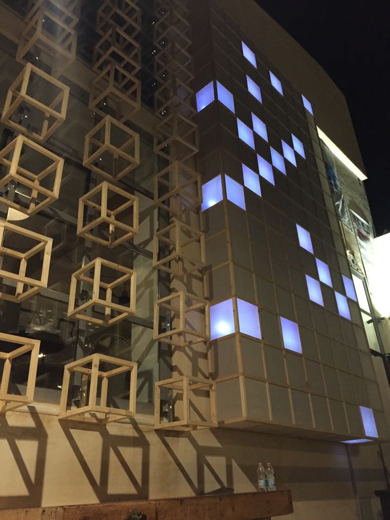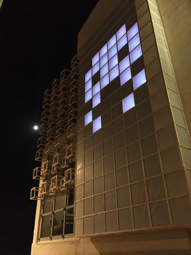 Una grandissima installazione in verticale, composta da uno speciale e inconsueto schermo gigante, un mega monitor composto da 8 cubi di base per 16 cubi di altezza. Sono 128 enormi pixel, che all’imbrunire prendono forma dando vita a disegni e animazioni al led mapping a cura di Pixel Shapes. Questo schermo grezzo, primordiale, richiamando l’effetto a 8 bit anni ’80 offre una visione così sgranata da indurre a riflettere su come nella quotidianità ci siamo invece ormai abituati a guardare tutto in modo filtrato, attraverso un monitor, un display. Una realtà sempre più definita, ad alta risoluzione, una realtà a 4K talmente vera da farci dimenticare talvolta dello schermo che ci separa dal reale.