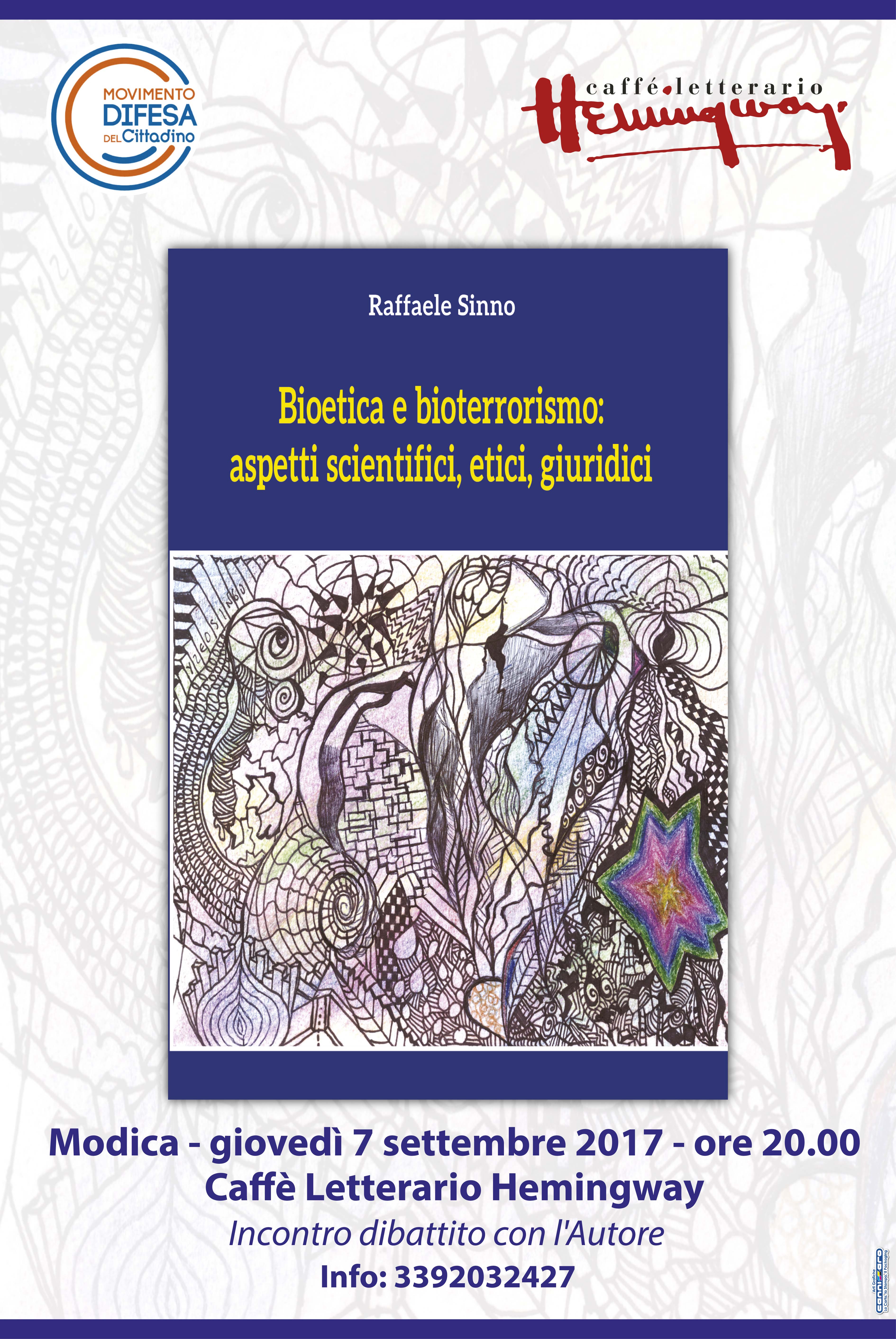 Domani, giovedì 7 Settembre alle ore 20,00 presso il Caffè Letterario Heminguay a Modica, si terrà un incontro dibattito con Raffaele Sinno, prendendo spunto dalla sua ultima pubblicazione: “Bioetica e bioterrorismo: aspetti scientifici, etici, giuridici”.