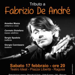 L’associazione culturale SiciliaInMusika, con la direzione artistica di Maurizio Diaria organizza per questo Sabato 17 febbraio 2018 alle ore 20,00 il concerto Tributo a Fabrizio De Andrè che si terrà al Teatro Ideal (P.zza Libertà – Ragusa)