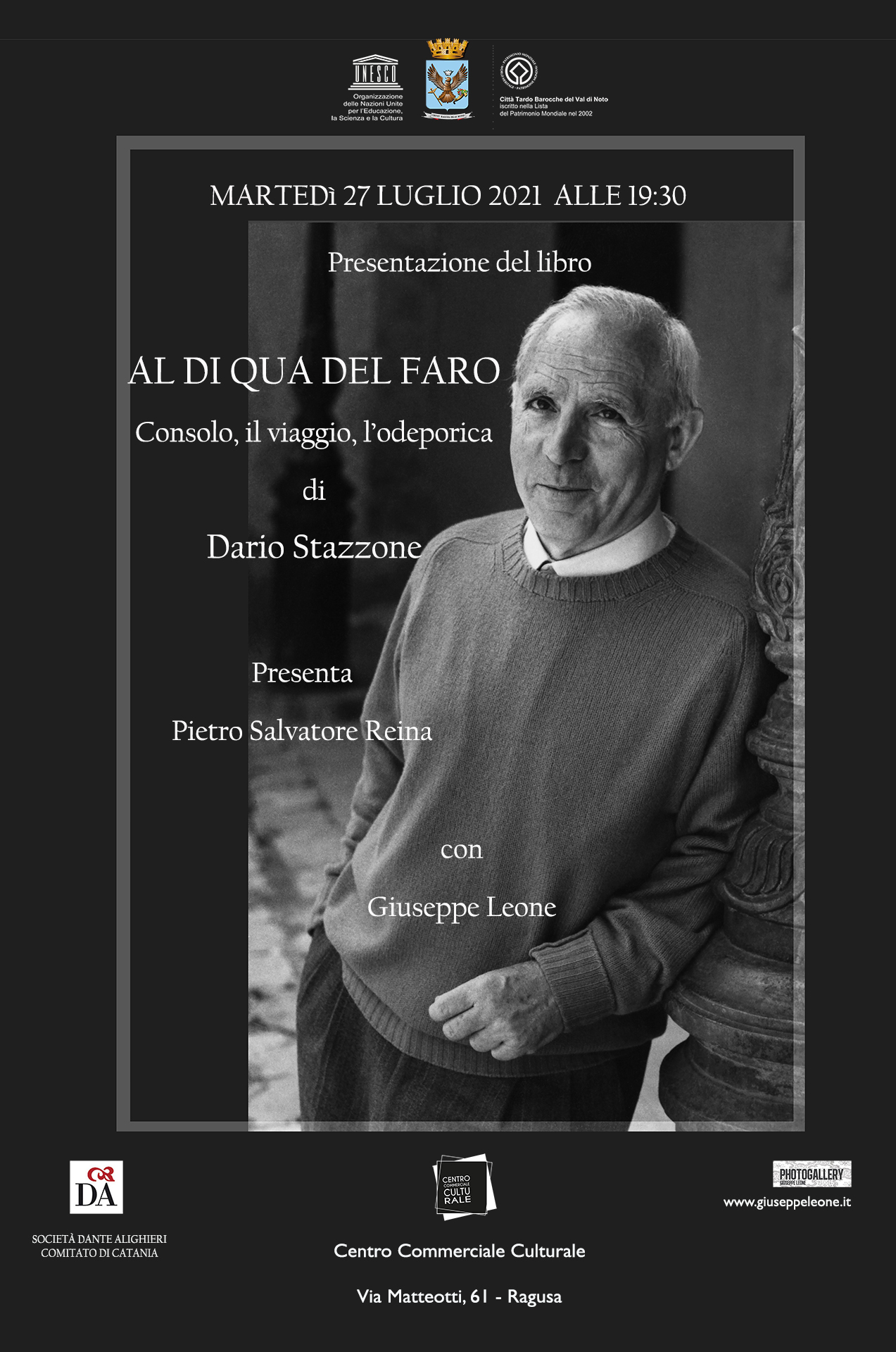 La Photogallery Giuseppe Leone in collaborazione con il presidente del comitato di Catania della Società Dante Alighieri, Dario Stazzone, presenta giorno 27 luglio 2021 alle ore 19:30 ,presso il Centro Commerciale Culturale di via Giacomo Matteotti n. 61, il libro "Al di qua del Faro. Consolo, il viaggio, l'odeporica" di Dario Stazzone, casa editrice Leo S. Olschki, collana "Polinnia", vol. 32.