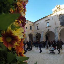 SCICLI – Una *scultura monumentale* con intrecci di medeola e circa *30.000 fiori* tra crisantemi e gerbere al centro della suggestiva cornice del chiostro del Convento del Carmine a Scicli. Un’atmosfera magica ha circondato oggi pomeriggio il centro della città barocca, per *inaugurazione della V edizione di Rubino*, la manifestazione che omaggia l’enogastronomia di eccellenza del territorio. Una sorpresa firmata dal *duo artistico Vinci/Galesi* (Sasha Vinci e Maria Grazia Galesi), realizzata in collaborazione con i bardatori di Scicli dei gruppi “Le Milizie” e “Balicu e Pagghiare”, il sostegno di Mercato del fiore e Flor Guarino e la collaborazione della galleria A29 PROJECT ROOM.