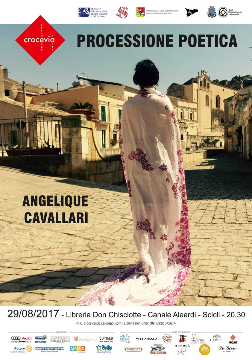 Il pubblico la segue attento, come fosse la processione poetica di una straordinaria attrice-autrice. Ci sono le luci della città, le stelle, la luna, l’atmosfera è magica. Angélique si ferma a leggere sul primo ponte del canale. E’ in piedi, piegata sulle proprie gambe, appoggiata alla ringhiera. Più che recitare l’attrice riesce a vivere e trasmettere il cuore del componimento poetico. Il suo corpo, leggero, si muove in perfetta sintonia tra le parole, le pause, il ritmo. Dopo un po’ Angelique sente che è arrivato il momento di proseguire verso la terza e ultima tappa della sua processione poetica. Il luogo prescelto sono le scale che portano alla Chiesa del Carmine. Anche qui l’attrice viene seguita dal suo gruppo di fedeli cui si aggiungono quelli di un ristorante vicino. Anche qui Angélique Cavallari, in un luogo simbolo di Scicli, regala passione, emozioni, sentimento… sembra quasi che Poesia ininterrotta, Paul Eluard l’abbia scritta per lei.