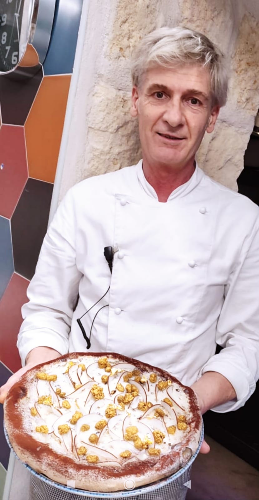 “Ho immaginato una pizza con sopra l’oro, commestibile e utilizzo un impasto lievitato più di 72 ore – racconta Carbonaro che è ormai conosciutissimo in città e in provincia per le sue creazioni gastronomiche – Quindi è impasto leggerissimo e che si ben digerisce. Ho creato un letto di ricotta ragusana al forno mantecata con anice stellato, cioccolato di Modica fondente. In uscita aggiungo farina di cocco assieme a delle delle pepite di cioccolato di Modica fondente con oro 24k commestibile e cocco fresco a fettine sottilissime”.