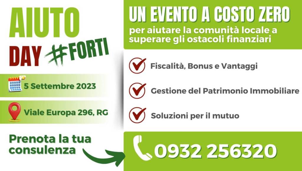 Chiunque desideri partecipare all’Aiuto Day Forti e parlare con uno dei consulenti specializzati, ha ancora la possibilità di prenotarsi tramite WhatsApp al seguente link: https://wa.me/393338766033 oppure chiamare al numero: 0932 256320