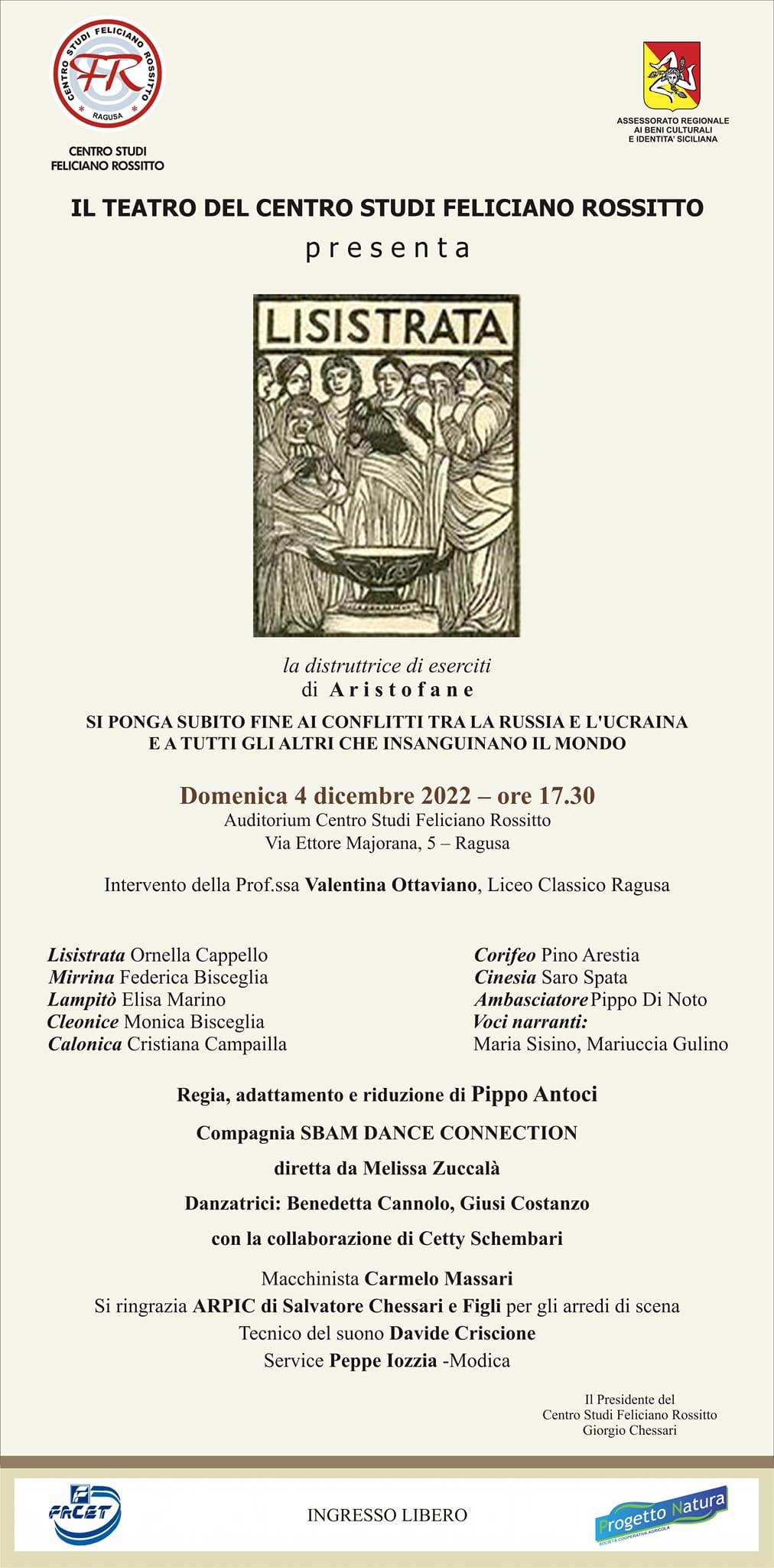 “Mettendo in scena una riduzione della commedia “Lisistrata” di Aristofane, scritta circa 2500 anni fa – spiega il presidente del Centro Studi on. Giorgio Chessari – vogliamo porre l’accento su come il tema della pace sia sempre stato cruciale per la nostra civiltà e come, già allora, si riflettesse su come far terminare le guerre. Quella di Aristofane è una commedia di cui sono protagoniste le donne, Lisistrata in particolare, il cui nome in greco antico significa “Colei che scioglie gli eserciti”, alla quale viene l’insolita e originale idea di portare gli uomini a più miti consigli proponendo a tutte le donne dei soldati impegnati nel conflitto tra Atene e Sparta una sorta di sciopero dell’amore. Ecco: questa idea dell’amore usato per estinguere la guerra, sebbene nell’opera sia una soluzione comica, è il messaggio di pace che da Ragusa vogliamo diffondere nella speranza che tutte le forze politiche, sindacali, civili e religiose se ne facciano carico per diffonderlo a loro volta. Il messaggio, ovviamente, non si riduce solo a quello della pace da far trionfare su ogni conflitto, ma c’è pure la questione femminista, per quanto possa esserlo un’opera del 411 a.C.. Le donne, che nell’antica Grecia non hanno voce in capitolo nella gestione della città, figuriamoci nei temi della guerra, compiono un atto rivoluzionario occupando l’acropoli. Da lì, dal centro politico, religioso ed economico di Atene, queste donne esercitano il diritto di scegliere, prendono una decisione che riguarda tutti, una possibilità per loro mai avuta prima. Le donne raccontate da Aristofane vogliono tornare alla normalità, rivogliono i mariti sani e salvi a casa e che la guerra finisca, non progettano di prendere il potere e tenerlo. Sarebbe stato inimmaginabile per quel periodo, ma la loro rivoluzione è un segnale che riguarda non solo la pace, ma la parità”.