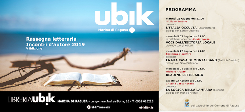 MARINA DI RAGUSA (RG) – Il profumo delle pagine di un libro. A Marina di Ragusa l’estate ha l’aroma di una rassegna letteraria che si specchia nell’azzurro mare ibleo. Dal 25 giugno al 3 agosto, nella centralissima piazza Torre, tornano gli appuntamenti di “Incontri d’autore”, a cura della locale Libreria Ubik: cinque date che caratterizzeranno le calde serate estive, in compagnia del dolce suono delle onde. Apre la quinta edizione della rassegna, martedì 25 giugno, il procuratore Giuliano Turone e il suo libro “L’Italia occulta” (Chiarelettere); mercoledì 3 luglio riflettori sulle voci dall’editoria locale in collaborazione con “Libe(r)i a Ragusa”. Si continua mercoledì 17 luglio con il primo libro di Costanza Diquattro “La mia casa di Montalbano (Baldini+Castoldi); mentre protagonisti della serata di mercoledì 24 luglio saranno Michele Arezzo e il suo reading letterario, infine sabato 3 agosto sarà Cristina Cassar Scalia a chiudere la rassegna con il suo “La logica della lampara” (Einaudi) (inizio degli incontri ore 21.00).
