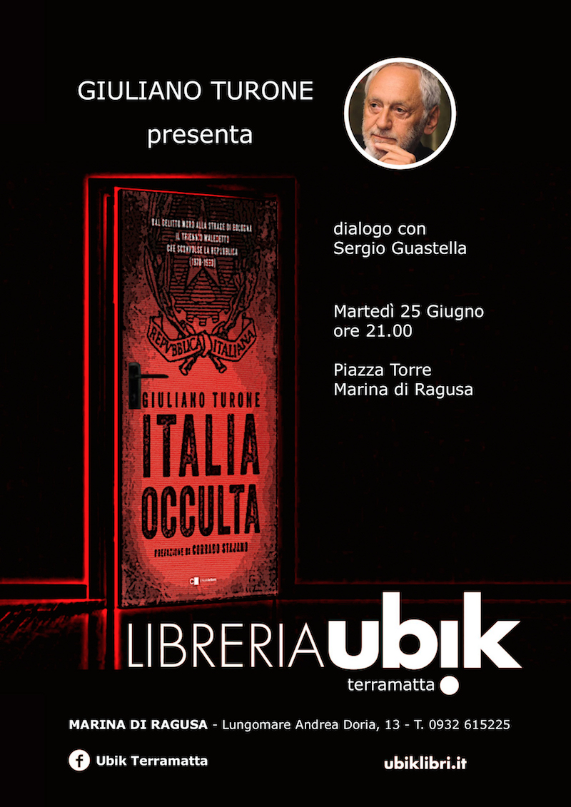 A Marina di Ragusa presenterà il suo ultimo libro “L’Italia occulta” (Chiarelettere), una fotografia del nostro Paese nel “triennio maledetto”, dal delitto Moro alla strage di Bologna. Tre anni, dal 1978 al 1980, in cui l’Italia fu attraversata da una lunga serie di eventi drammatici, ricostruiti magistralmente dal magistrato all’epoca impegnato in prima linea. Risvolti trascurati o persino dimenticati, storie di uomini crudeli, ma anche di eroi nazionali, particelle di una storia comune su cui oggi Turone riporta la memoria collettiva. A condurre l’incontro sarà Sergio Guastella. Ingresso gratuito. Per info 0932 615225 e la pagina fb Libreria Ubik Terramatta.