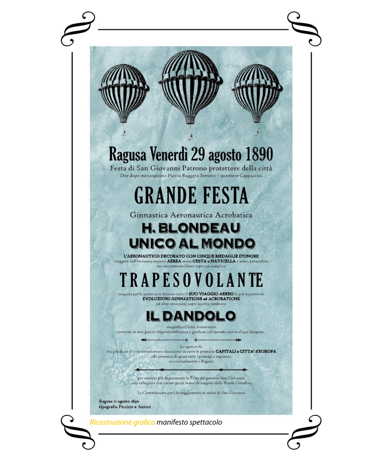 Nell’agosto del 1890 Blondeau fu chiamato a esibirsi in occasione dei festeggiamenti laici abbinati alle celebrazioni religiose per il patrono san Giovanni. Avrebbe dovuto lanciarsi con la sua mongolfiera da piazza Ruggero VII (oggi piazza Cappuccini) ed estasiare la folla con le sue acrobazie eseguite sul trapezio montato al posto del cestello della mongolfiera. Le avverse condizioni metereologiche non permisero tuttavia l’esibizione per diversi giorni. Il 3 settembre l’insoddisfazione della folla raggiunse l’apice, i fischi e le urla si fecero assordanti. La sete di spettacolo della gente ebbe la meglio sul buon senso, spingendo Blondeau alla decisione finale, lanciarsi. Dopo pochi minuti purtroppo la sua mongolfiera si scagliò contro le montagne, lui fu sbalzato fuori, cadendo tra la vegetazione della valle, dove in serata i soccorritori recuperarono il corpo senza vita. Il responsabile dei festeggiamenti fu arrestato, la folla balzò agli onori della cronaca come la responsabile dell’evento – una condanna a morte di cui si parlò negli anni a venire. L’amministrazione dell’epoca si occupò del rimpatrio della moglie e della figlia, promettendo loro di onorare per sempre la memoria del valoroso artista. Gli intitolò due strade e stanziò persino la somma necessaria per la realizzazione nel cimitero della città di un mausoleo dedicato a Henry che fu poi riqualificato negli anni ’40 del secolo successivo. Poi l’avanzare del tempo fece scemare l’eco iniziale e tutto finì nel dimenticatoio. È lì che Ibla Buskers lo recupera, lo pulisce dalla polvere della storia e lo restituisce ai suoi contemporanei e, da questi, alle generazioni che verranno.
