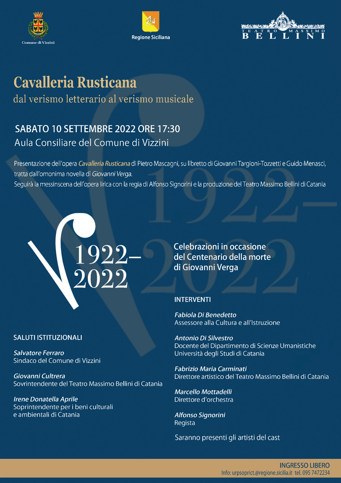 Le iniziative ufficiali del centenario verghiano stanno trovando grande interesse grazie agli approfondimenti scientifici voluti dal Comitato in sinergia con la Fondazione Verga e le Università siciliane di Catania, Palermo, Messina ed Enna. “Convegni, mostre, cinema, teatro, spettacoli, costituiscono quel mix perfetto di attività che, nel Centenario della morte di Verga, mette in luce tutti gli ambiti di produzione dello scrittore evidenziandone le peculiarità ed attualizzando il messaggio all’interno di un progetto – sottolinea l’assessore dei Beni culturali, Alberto Samoná – che vuole contribuire a rinnovare la conoscenza e l’interesse per la vita e l’opera del grande scrittore”.