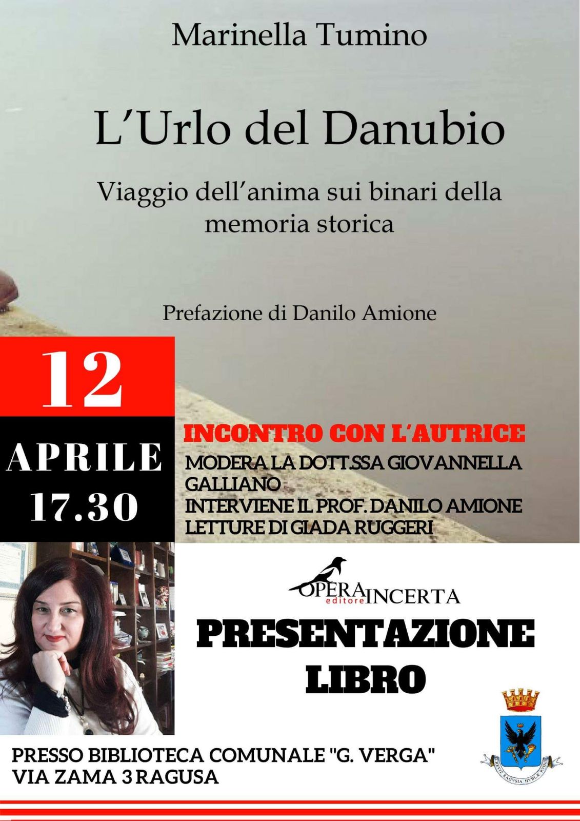 Giovedì 12 aprile, alle ore 17,30, la Biblioteca civica “G. Verga” di via Zama organizza un incontro culturale con la scrittrice ragusana Marinella Tumino che presenterà il suo libro “L’urlo del Danubio”.