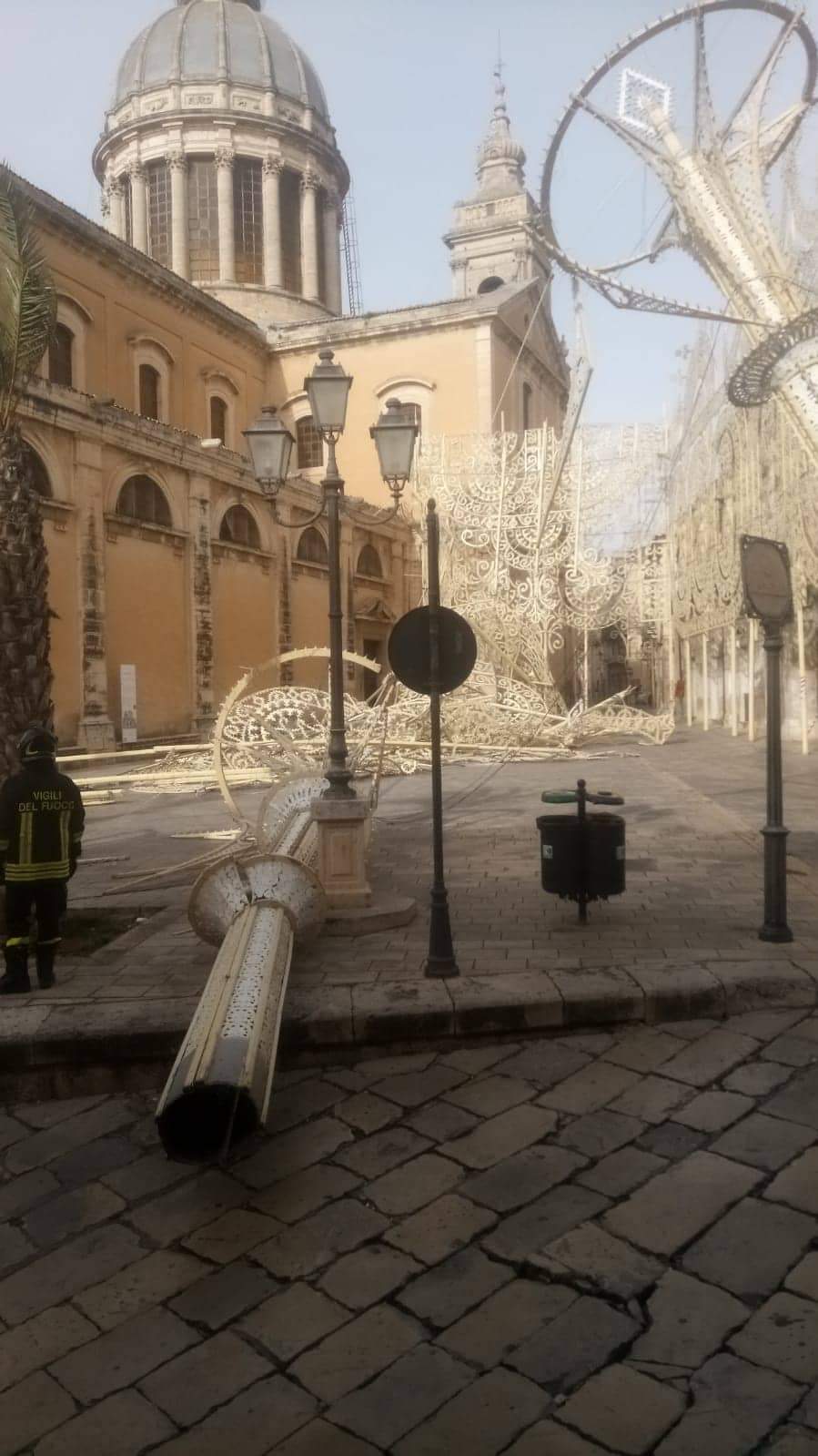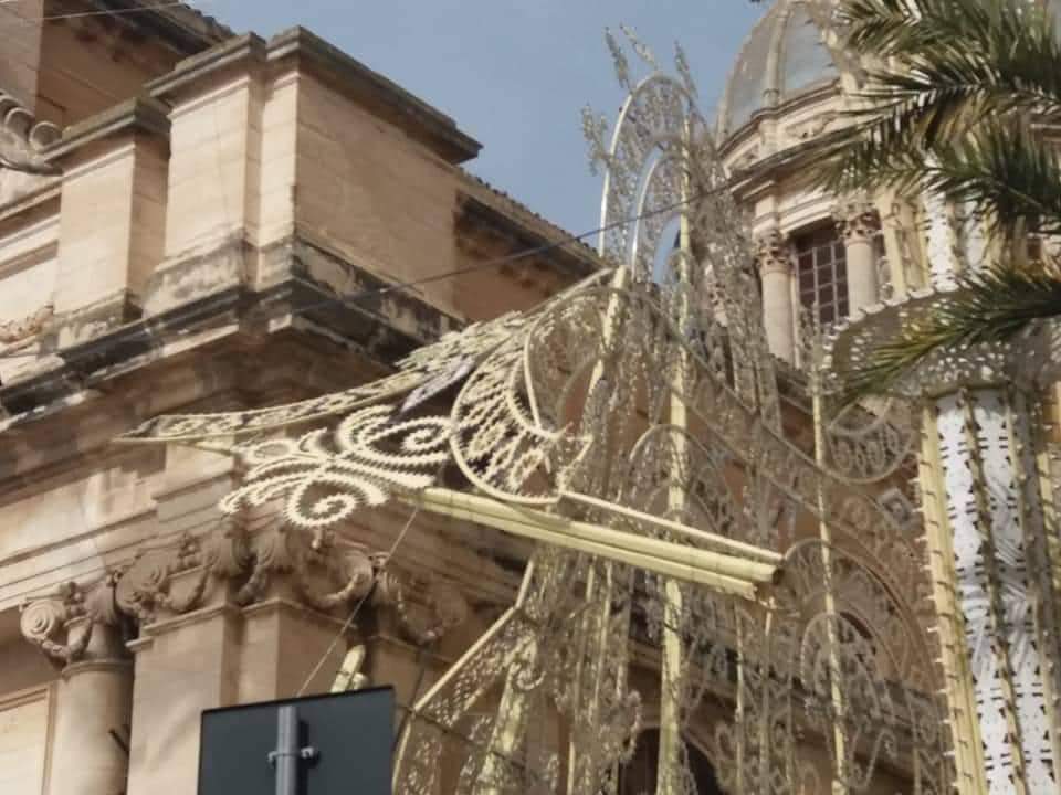 Sono appena intervenuti sul posto i vigili del fuoco per mettere in sicurezza la zona. A causa del forte vento, la festa della Pasqua a Comiso si è svolta all’interno della Basilica ed è stata rimandata a domenica prossima.