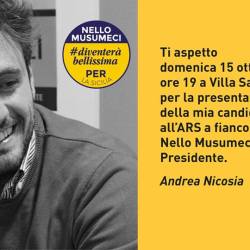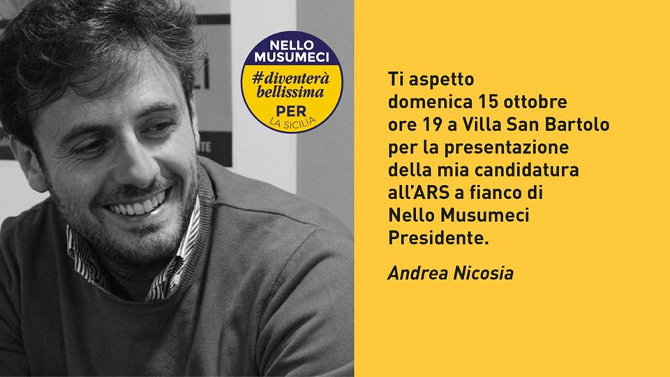 Così Andrea Nicosia, candidato della lista Diventerà Bellissima, lancia la sua convention domani a Villa San Bartolo alle ore 19. Nel corso dell’incontro, Nicosia – giovanissimo presidente del consiglio comunale di Vittoria e fortemente accreditato per uno scranno a Palermo – illustrerà i punti cardine per il rilancio della città e mostrerà alla platea i progetti utili e fermi da anni alla Regione.