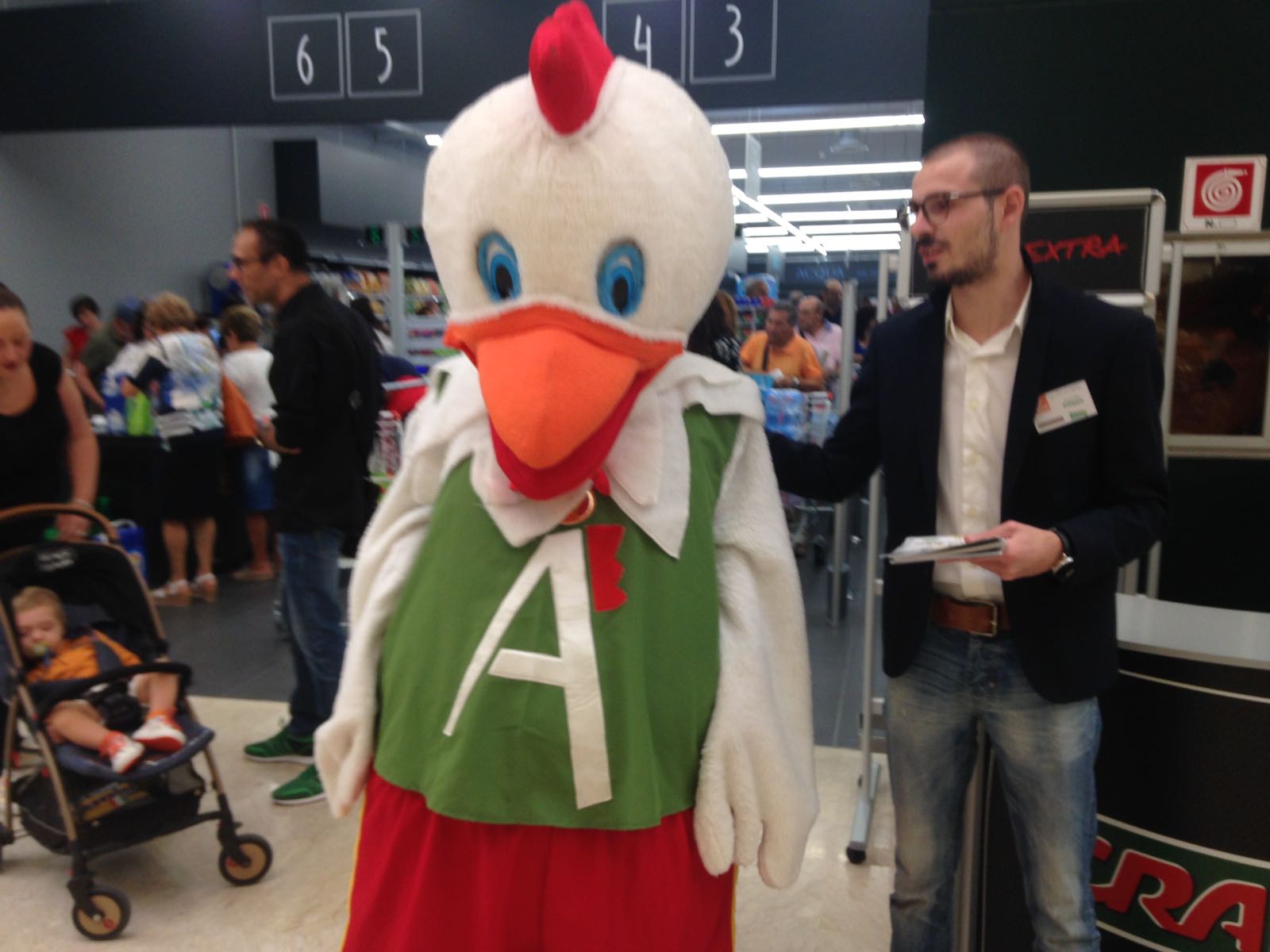 Stamani è stato un momento di festa e, tra le attrazioni, non è mancata la mascotte di Avimecc, “Primo”, il simpatico pollo che porta allegrie ed offerte. Chi acquista in questo fine settimana due prodotti Avimecc riceverà in regalo un contenitore portacibi. Durante la giornata sono previste degustazioni a base di pollo, spiedini e würstel Avimecc.