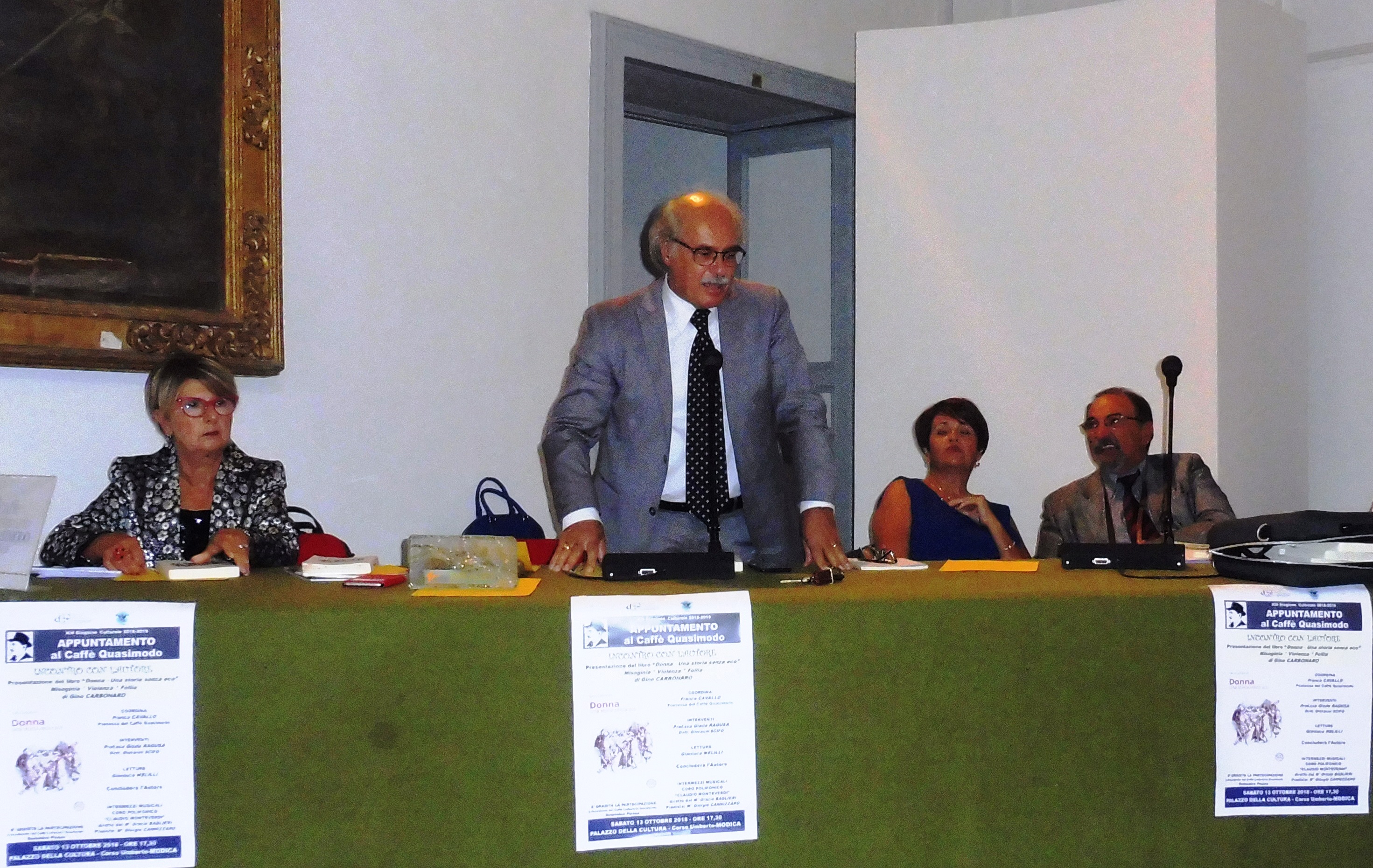 Apertura ufficiale della XIII stagione del Caffè Letterario Quasimodo , lo scorso sabato a Modica . Il libro di saggistica “Donna. Una storia senza eco”, dello scrittore ragusano Gino Carbonaro, è stato al centro della serata, che ha visto una larga partecipazione di pubblico che da anni segue i “cosiddetti “sabati letterari” del circolo culturale modicano.