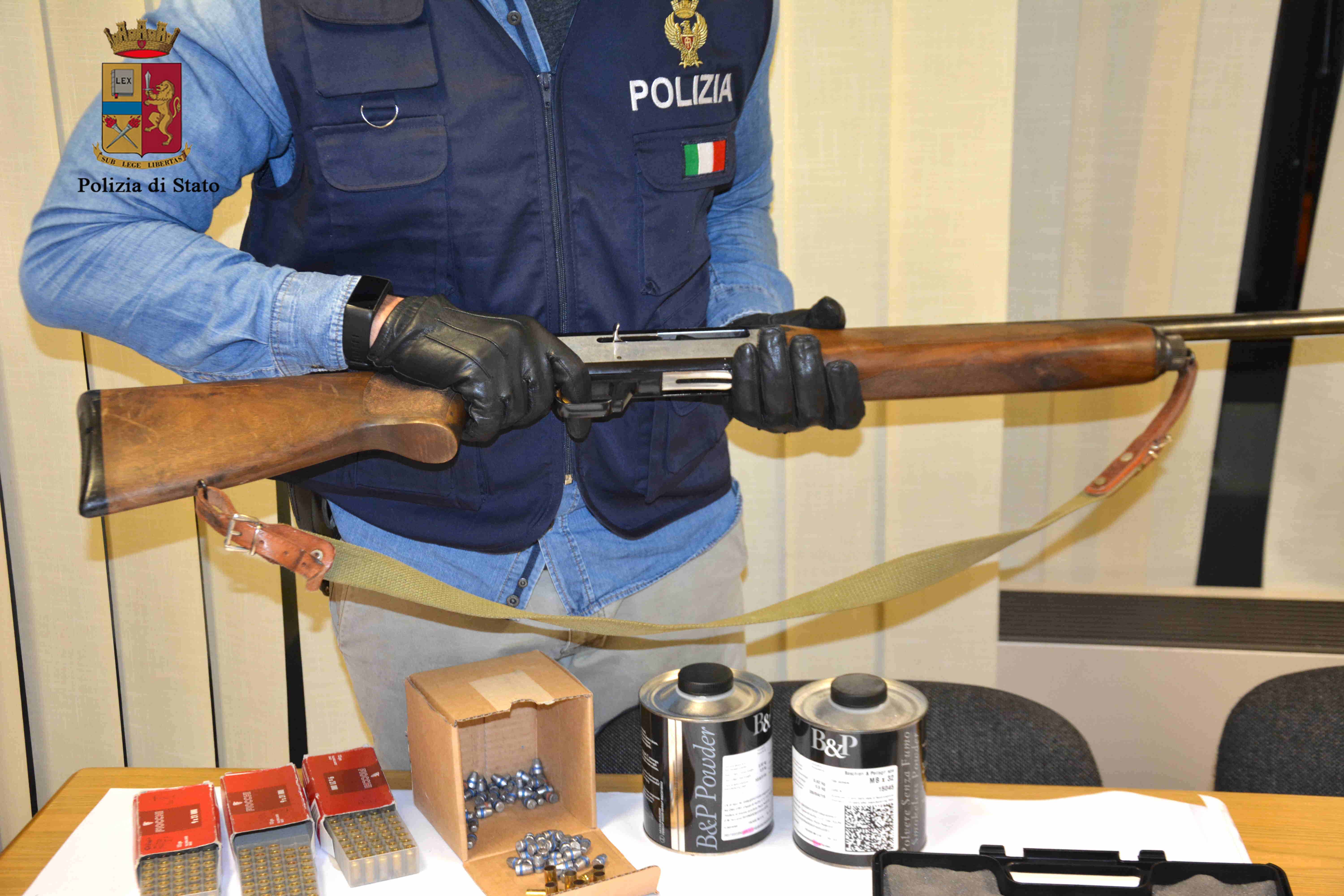 Considerata la palese inidoneità nel detenere armi, gli uomini della Squadra Mobile hanno sequestrato una pistola semi-automatica, nr. 5 pacchi di cartucce da 50, nr. 2 barattoli di polvere da sparo, uno del peso di Kg. 0,500 ed altro del peso di Kg. 0,200, nr. 99 inneschi, nr. 40 bossoli e nr. 82 ogive in piombo.