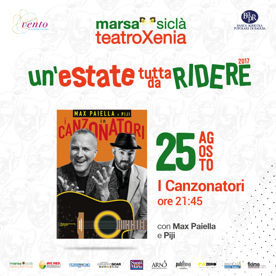 SCICLI (RG) – Un successo dietro l’altro per la settima rassegna teatrale “La giara e il gelsomino” che si svolge al Teatro Xenia del Marsa Siclà Residence a Sampieri. Ed è destinato a trovare il consenso del pubblico anche il prossimo appuntamento estivo, in programma venerdì sera 25 agosto alle 21,45 quando andrà in scena uno spettacolo tutto da cantare e da ridere. L’appuntamento infatti è con Max Paiella e Piji in “I canzonatori”, uno sguardo satirico e romantico sull’Italia delle canzonette e dei cialtroni, dei sognatori e dei poeti, dei cantautori e dei Sanremi, delle macchiette e degli impostori. Una formula diversa di fare spettacolo che si potrebbe definire come “concerto di teatro musicale” in cui i due mattatori della serata si ritroveranno in mezzo ad una sequela di note e spartiti, chitarre e testi, personaggi e canzoni, assemblando e rivoluzionando il tutto con leggerezza ed ironia e finendo col tratteggiare un percorso sbeffeggiante ma anche innamorato sul nostro Belpaese di ieri e di oggi. Dunque uno spettacolo teatrale cantato con due artisti d’eccezione pronti a cimentarsi in questioni “comico-musicali” per mescolare parole, musica e gag in strampalate rivisitazioni ma seguendo un fedele percorso della storia della musica italiana. E così Max Paiella, colonna sonora vivente della trasmissione radiofonica di Radio2 “Il Ruggito del coniglio”, dopo aver “canzonato” politici e personaggi tv, si ritrova a riprendere in mano alcuni dei suoi migliori cavalli di battaglia, a farli “reagire” con la musica e a “canzonare” le canzoni stesse con l’apporto di Piji e del polistrumentista Flavio Cangialosi, fino a svelare l’essenza dell’animo italiano: scanzonato, canzonettaro e canzonatore. La rassegna “La Giara e il gelsomino” è promossa dall’associazione Vento ed è sostenuta da Banca Agricola Popolare di Ragusa, “Residence Marsa Siclà” e dagli sponsor Avi.Med., Cannizzaro, Acqua Santa Maria e Gruppo Scar. Mediapartner sono: Zero Comunicazione Integrata, Arnò e Publinova, mentre l’ufficio stampa è curato da MediaLive. Si ringrazia per la collaborazione: DolceCasa e Ficima alluminio. Prezzi biglietti: poltronissima (solo su prenotazione al numero 0932 1838969) 18 euro, posto intero 12 euro. Per i soci “Vento” ed enti associati prevista una riduzione: 15 euro per la poltronissima (solo su prenotazione) e 10 euro per il posto intero.