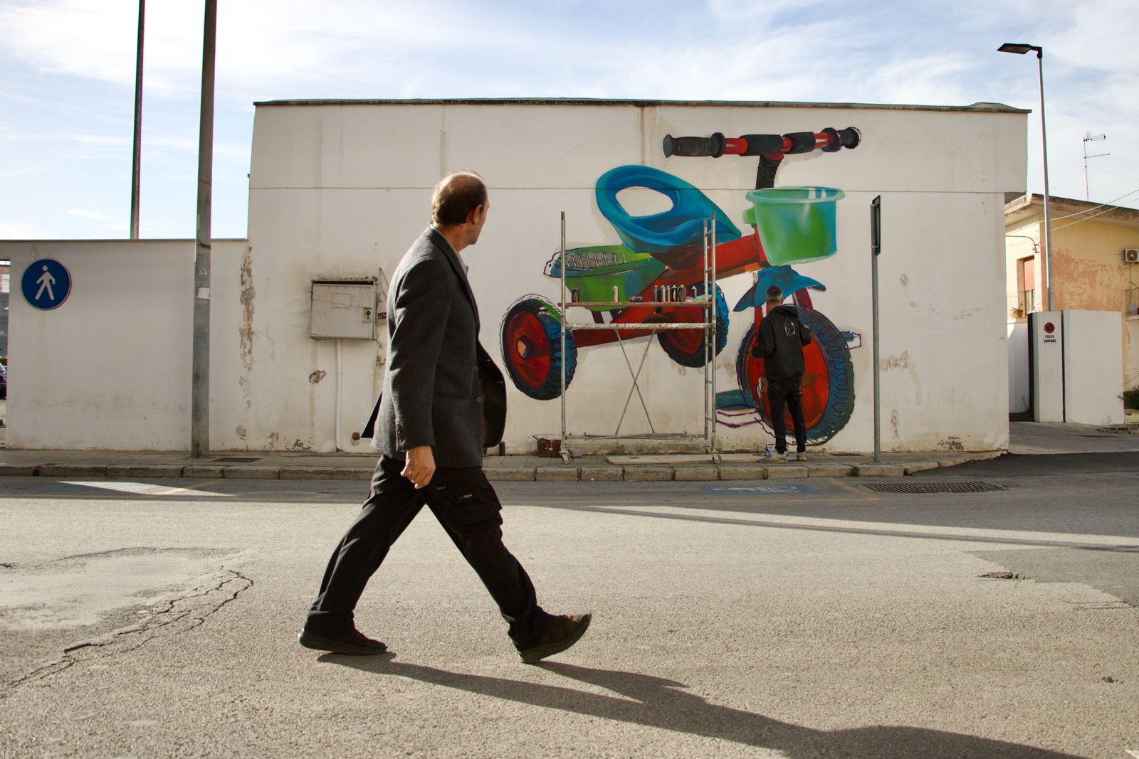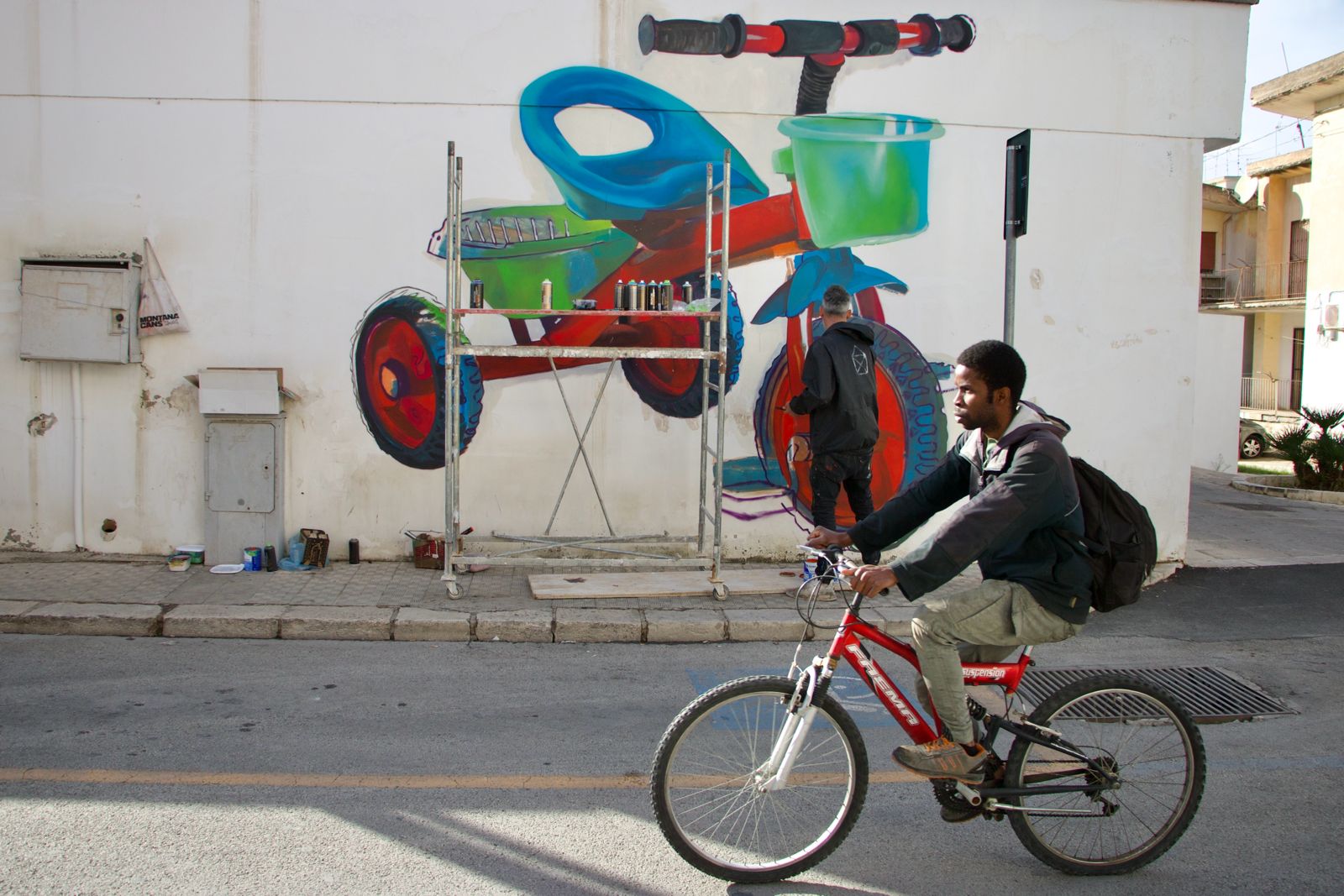Due eccessi, due variazioni di un unico tema, un unico quadro che riflette in qualche modo i contrasti della realtà casmenea, densa di arte e cultura – Ma’Claim e Morik sono rimasti impressionati dal fatto che un solo paese possa contenere un patrimonio immateriale così vasto – epperò non esente da quell’isolamento che cammina oggi a braccetto con la desertificazione demografica e urbana». Ma l’unitarietà dell’opera non finisce qui. Diventa triplice a pochi metri di distanza, in un secondo murales realizzato da Case Ma’Claim, ancora su Corso Ho Chi Minh: stavolta, un coloratissimo triciclo, costruito rigorosamente in plastica e in serie, senza nessuno alla guida. È una rilettura del passato nel probabile futuro, che è in parte già attuale: è il progressivo svuotamento di paesi e quartieri, dove è sempre più raro vedere bambini che giocano in strada. Tre lavori che si osservano, dunque, puntando lo sguardo sulla città e lanciando Comiso come capofila di un iter che, dopo FestiWall, Bitume e CAP, potrebbe coinvolgere altri comuni siciliani, alla ricerca del “genius loci” nel senso moderno dell’espressione, come interazione tra un luogo e la sua identità, dunque tra sviluppo architettonico, cultura e società.