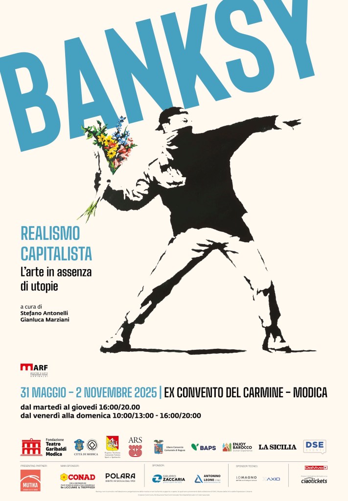 La mostra, curata da Stefano Antonelli e Gianluca Marziani, è organizzata dalla Fondazione Teatro Garibaldi, in collaborazione con il quotidiano La Sicilia, con Domenico Sanfilippo Editore, DSE Pubblicità, CSAB Uniroma3 – Fondazione Centro Studi Archivio Banksy, con il sostegno della Regione Siciliana, dell’ARS, del Libero Consorzio Comunale di Ragusa e del Comune di Modica e con il supporto di aziende e realtà locali: presenting sponsor Mutika EMC, main sponsor Conad e Polara, sponsor Gruppo Zaccaria e Antonino Leone & figli, partner Dal Vivo Produzioni, sponsor tecnici Galleria Lo Magno e Axio Group. La mostra è l’esito di un progetto scientifico, critico ed interpretativo indipendente, ideato, curato e finanziato fuori dalla sfera d’influenza dell’artista. Banksy non è coinvolto nell’ideazione e progettazione della mostra e non ha fornito supporto o opere, le quali sono provenienti dalla collezione del CSAB Uniroma3, Fondazione Centro Studi Archivio Banksy. Il progetto espositivo, testi e immagini del catalogo, ogni opera, documento o materiale presente in mostra, sono stati supervisionati, verificati per accuratezza e autenticità, e approvati per conto di Banksy da Pest Control Office ltd (Londra), unico ente autorizzato a certificare l’autenticità delle sue opere. Info sul sito web www.fondazioneteatrogaribaldi.com; biglietteria online su https://www.ciaotickets.com/it/biglietti/banksy-realismo-capitalista-modica.