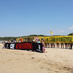 Blitz della Goletta Verde sul fiume Irminio: i volontari espongono gli striscioni contro petrolio: “Che vergogna!”, “No Trivelle” e “Stanchi di rischiare”