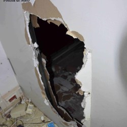 Le anomalie permettevano di rilevare la possibile introduzione di ignoti all’interno dei locali attigui a quelli in cui è allocata la cassaforte del supermercato dove vengono custoditi gli incassi giornalieri. Gli uomini della Squadra Mobile, previ contatti con il personale della vigilanza, constatava che il filo di uno dei sensori dell’allarme era stato tranciato e la porta in ferro dotata di un grosso lucchetto era stato posizionato in modo tale da essere prontamente tagliato con il flex.