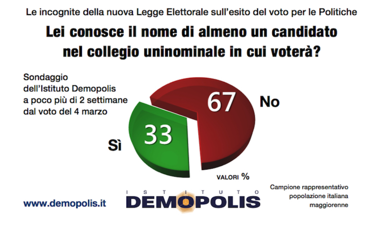 Secondo un sondaggio condotto nelle ultime 48 ore dall’Istituto Demopolis, appena un terzo dei cittadini è oggi a conoscenza del nome di almeno un candidato nel collegio uninominale in cui voterà.