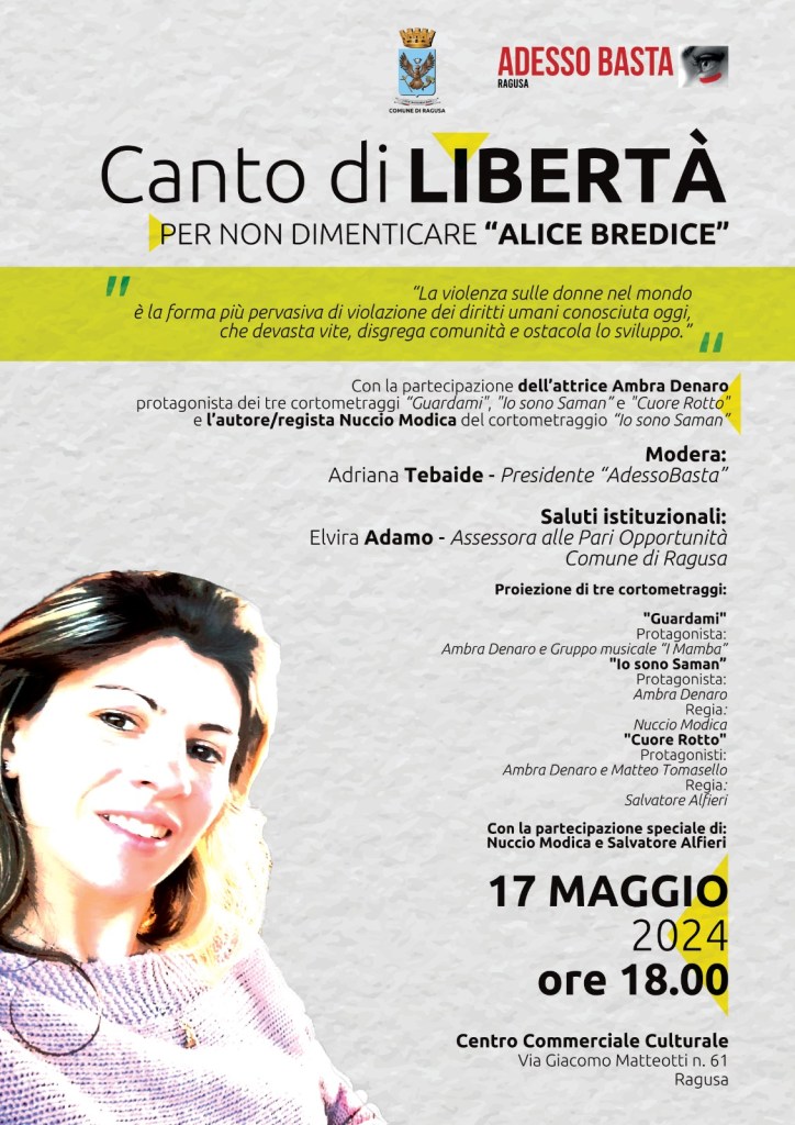 Il 17 maggio 2024, alle ore 18.00, al Centro Commerciale Culturale in via Giacomo Matteotti, 61 – Ragusa, l’Associazione “Adessobasta” organizza l’incontro “Canto di libertà”, dedicato ad Alice Bredice e a tutte le donne che hanno perso la vita a causa della violenza di genere.