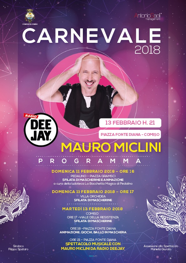 Carnevale a Comiso con varie iniziative. Si inizia domenica 11 febbraio con un doppio appuntamento. Alle 16 a Pedalino con la sfilata delle mascherine e poi alle 17 sfilata anche a Villa Orchidea. Grande festa poi martedi’ 13 febbraio con la sfilata delle mascherine alle ore 17 in viale della Resistenza. A seguire alle ore 18 in piazza Fonte Diana, con animazione, giochi e balli in maschera. Super appuntamento poi alle ore 21 in piazza Fonte Diana con lo spettacolo musicale con Mauro Miclini da Radio Deejay. Un’imperdibile occasione per divertirsi ballando. A comunicare il programma sono stati il sindaco Filippo Spadaro e l’assessore allo Spettacolo, Mariella Giurato.
