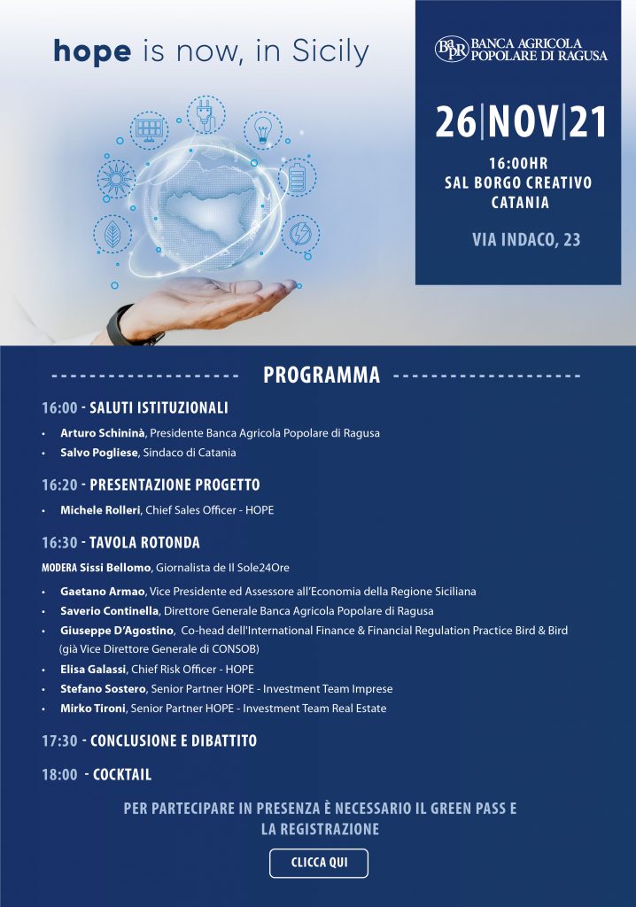 Si terrà il 26 novembre a Catania il convegno “HOPE is now, in Sicily” organizzato da Banca Agricola Popolare di Ragusa. L’evento si svolgerà alle ore 16:00 presso il SAL Borgo Creativo di Catania (via Indaco,23). In questa occasione verrà presentato HOPE, il progetto di finanza innovativa per lo sviluppo sostenibile del nostro Paese.