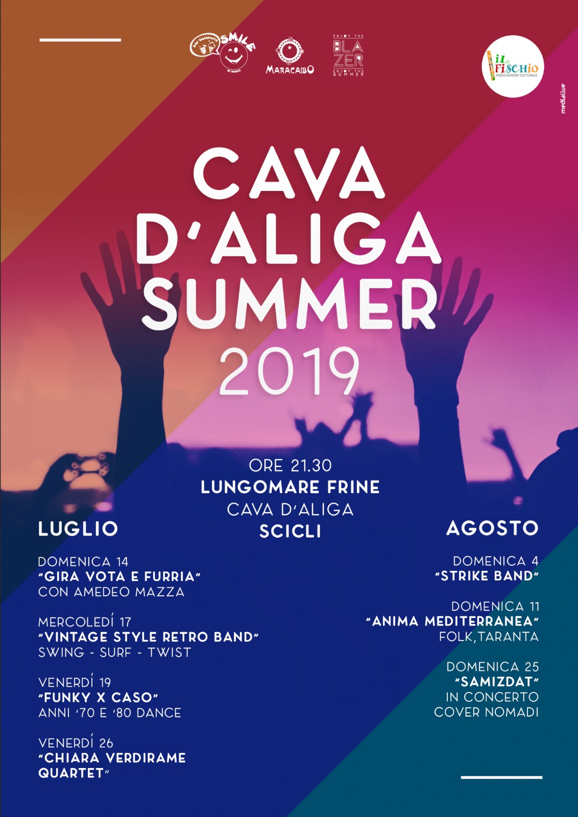 L’estate a Cava d’Aliga ha il ritmo della musica di “Cava d’Aliga Summer”: sette serate tutte da vivere per una vacanza dal puro divertimento. Promosso da tre noti locali della zona, Maracaibo, Blazer e Smile, con l’organizzazione dell’associazione “Il fischio”, il calendario di appuntamenti inizia domenica 14 luglio per concludersi domenica 25 agosto. Ospiti d’eccezione band da tutta la Sicilia che intratterranno il pubblico del Lungomare Frine (angolo Maracaibo), cuore della movida della frazione rivierasca dallo splendido mare e dalle spiagge libere.