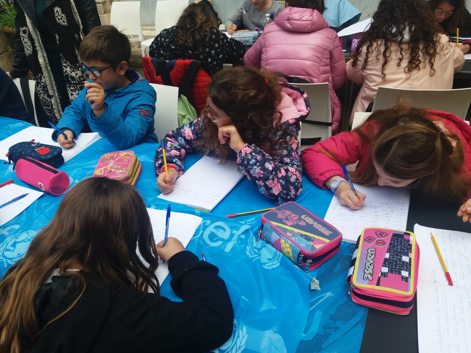 La II A della Don Milani ha invece beneficiato di una lezione di arte en plein air, condotta dal docente (e talentuoso pittore) Giovanni Blanco. Sui banchi allestiti nel cortile antistante la sede UNICEF, sopra le tovaglie azzurre dell’UNICEF, i ragazzi hanno lavorato creativamente sulla missione UNICEF e sulla Convenzione, già preparati nei contenuti, in classe, da Elisa Mandarà. Temi e poesie per gli alunni della Primaria della Don Milani, con la maestra Michela Rizzo Penna, e grandi emozioni anche per i bambini dell’Infanzia, con le maestre Luisa Arena e Laura Scifo, in un clima generale gioioso, di dialogo tra generazioni diverse di studenti.