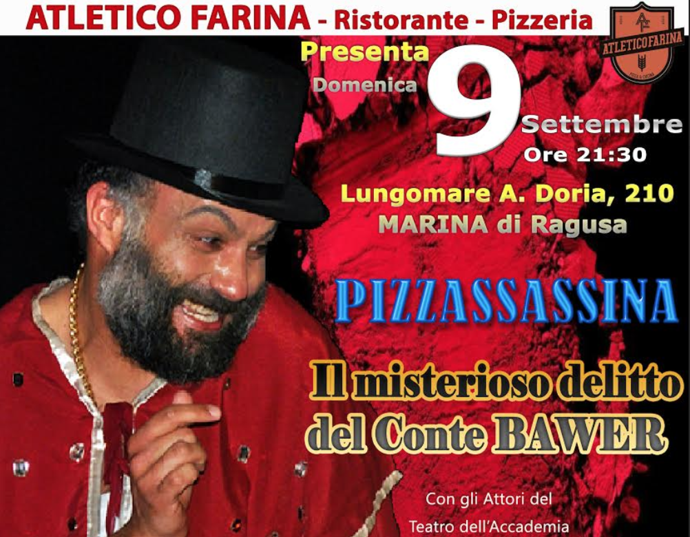 Tutto questo, forse…chissà se verrà raccontato domenica 9 settembre 2018 alle ore 21:30 nell’intrigante spettacolo “Il Misterioso delitto del Conte Bawer” Tour 2018 al Ristorante – Pizzeria ATLETICO FARINA di Marina di Ragusa. “Il misterioso delitto del Conte Bawer”, il pluripremiato spettacolo scritto e diretto dall’attore-regista Francesco Mazzullo, con il patrocinio del Ministero, <it.wikipedia.org/wiki/Ministero_per_i_beni_e_le_attivit%C3%A0_culturali> del Comune di Catania, della Regione Sicilia e della Provincia Regionale di Catania, dopo il sold out in tour nazionale a grande richiesta, venerdì 7 settembre 2018 alle ore 21:30, andrà in scena nel corso di una piacevole PizzAssassina presso il noto ristorante. L’avvincente nuova pièce della serie Thriller-Comedy al sapor di giallo, rinnovato e interpretato abilmente dagli attori del Teatro dell’Accademia di Catania dal 2013 al 2016 ha riscosso numerosi premi quali: Premio Miglior Regia, Migliori Attori Protagonisti etc….