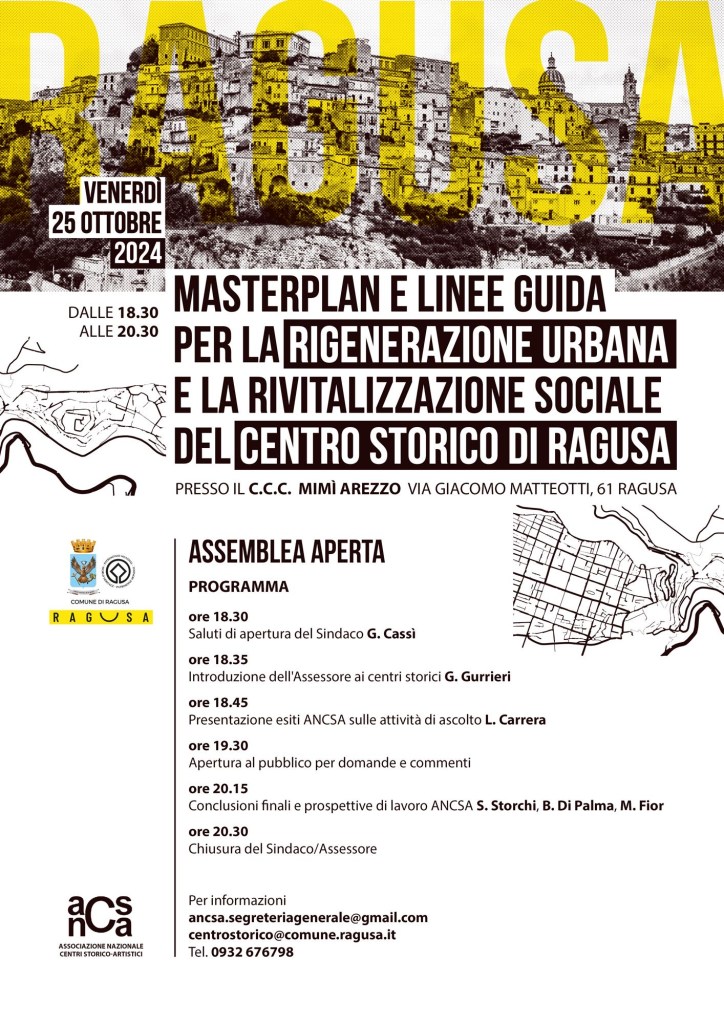 Questo percorso è partito lo scorso febbraio, con un’attività di ascolto condotta dal gruppo di lavoro dell’ANCSA, composto da docenti di diverse università italiane. Da queste consultazioni sono emerse sia le criticità sia le grandi potenzialità del centro storico di Ragusa. Ora, si è pronti per un nuovo passaggio, con una assemblea aperta che si terrà venerdì 25 ottobre dalle 18.30 alle 20.30 presso il Centro Commerciale Culturale di via Matteotti 61. L’incontro ha lo scopo di discutere i dati raccolti e definire la fase successiva che porterà alla creazione di un Masterplan condiviso, parte del più ampio piano strategico “Ragusa 2043”.