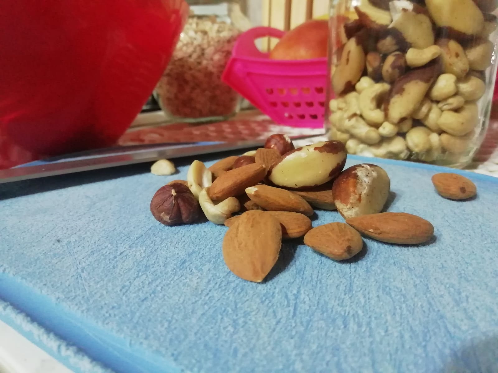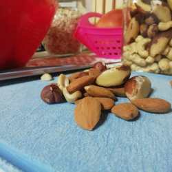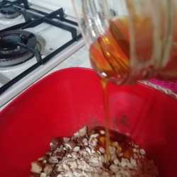 In una ciotola mettiamo due tazze di fiocchi d’avena. Aggiungiamo, poi, la frutta secca che preferiamo: mandorle, nocciole, noci, anacardi.