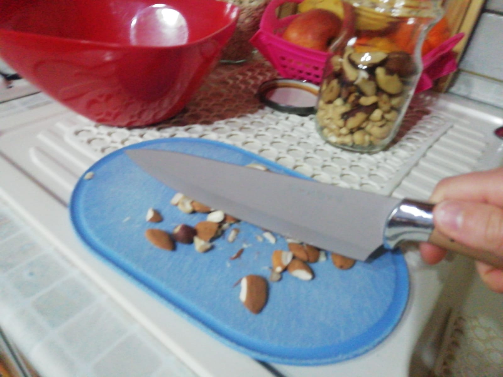 Nella nostra versione, abbiamo utilizzato mandorle (con guscio), anacardi, noci brasiliane, nocciole ma, ripetiamo, la frutta secca è a vostra scelta, potete utilizzarne anche solo un tipo, come le mandorle. Utilizziamo una tazza circa di frutta secca e la versiamo su un tagliere: qui, la taglieremo grossolanamente con un coltello. Aggiungiamo la frutta secca tagliata grossolanamente ai fiocchi d’avena e poi prendiamo un pezzo di cioccolato fondente idealmente al 70%. Qui, ne abbiamo utilizzato un pezzo al 90% ma potete anche utilizzare un cioccolato meno amaro.