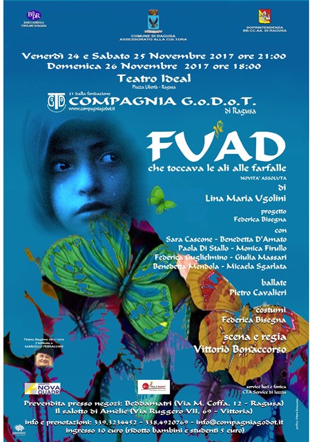 La Compagnia G.o.D.o.T. di Ragusa celebra la Giornata internazionale sulla violenza contro le donne con uno spettacolo intenso e toccante. Venerdì 24, sabato 25 e domenica 26 novembre, all’interno della 13^ stagione teatrale “Palchi DiVersi”, in scena al Teatro Ideal di Ragusa la prima assoluta del monologo “FUAD che toccava le ali alle farfalle”. L’opera è tratta dall’omonimo romanzo (ed Splen edizioni) di Lina Maria Ugolini, nota scrittrice e amica della compagnia di Vittorio Bonaccorso e di Federica Bisegna con cui si è sviluppato ormai da tempo un proficuo percorso lavorativo (la Ugolini scrisse infatti il suo primo lavoro teatrale “Un prestigiatore molto mago” proprio per la compagnia ragusana). La stessa Ugolini ha curato la riduzione del testo per la messa in scena, la regia è di Vittorio Bonaccorso, mentre il progetto teatrale e i costumi sono di Federica Bisegna e le ballate di Pietro Cavalieri.