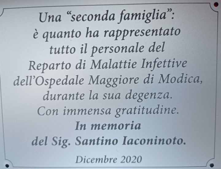 Devo dire, però, che c’è stato chi è riuscito a stargli accanto e alleviare almeno in parte questa sua sofferenza: mi riferisco a tutto il personale del reparto di Malattie infettive dell’Ospedale Maggiore di Modica ed è questa la motivazione della presente.
