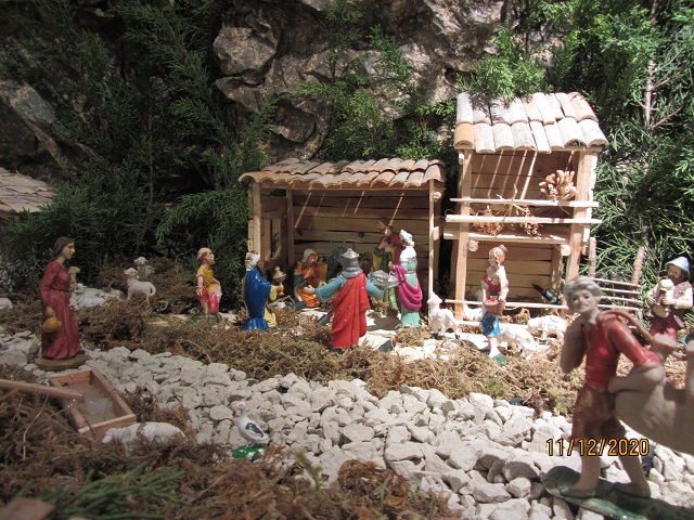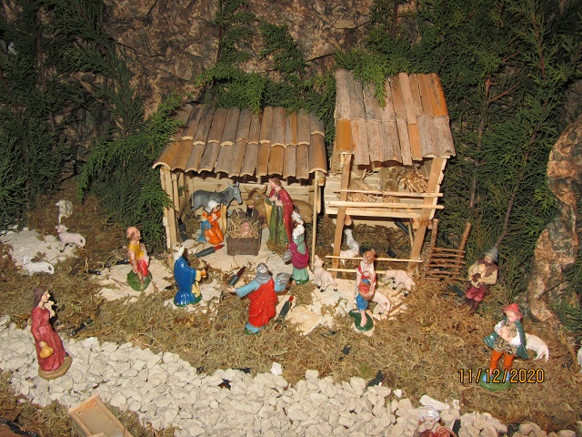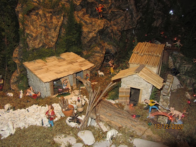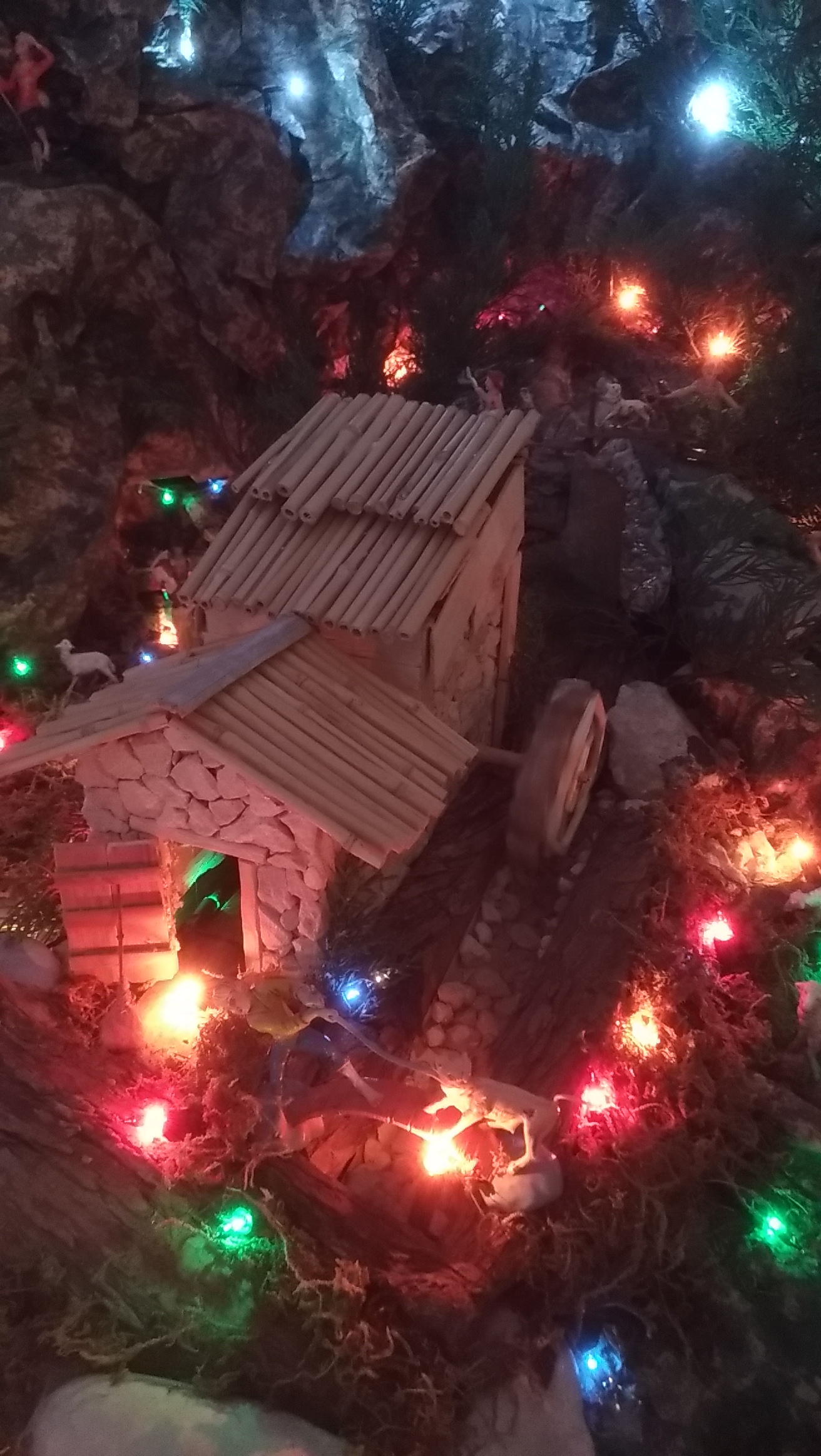 Il mio presepe è realizzato con materiali di riciclo come cassette della frutta, ghiaia, muschio naturale, cartone e carta. Ho pensato di rappresentare la natività come una stalla quindi una struttura povera in legno a differenza delle case, botteghe e mulino ad acqua in pietra e tetti in legno.