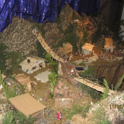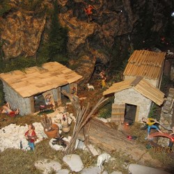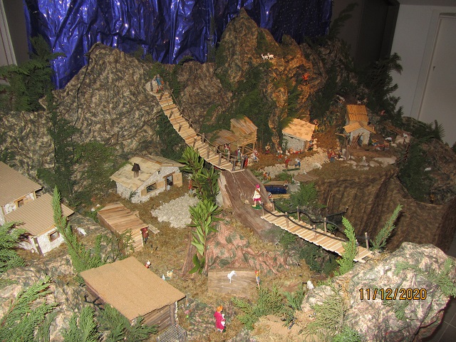 Tutte le strutture abitative sono state realizzate da me anno dopo anno con ghiaia e tetto in legno come anche il mulino ad acqua con la sua ruota che gira. L’acqua scorre lungo un canale in pietra, fa girare la ruota del mulino, pescatori sono fermi a pescare ed animali che bevono”.