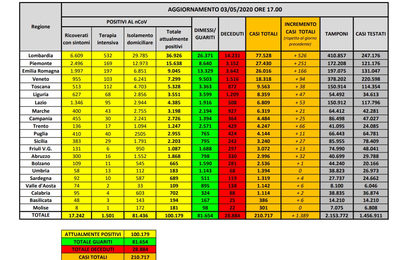 Rispetto a ieri i deceduti sono 174 e portano il totale a 28.884. Il numero complessivo dei dimessi e guariti sale invece a 81.654, con un incremento di 1.740 persone rispetto a ieri.