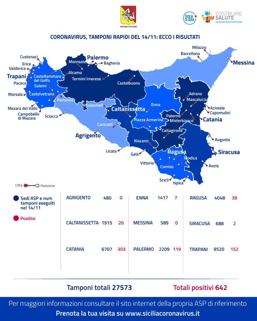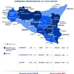 Sono 27.573 i tamponi rapidi eseguiti nella giornata di ieri nelle oltre 40 le città siciliane in cui è prevista la campagna attiva della Regione Siciliana per la ricerca del Coronavirus. I soggetti positivi individuati sono stati 642 (pari al 2,33 per cento).