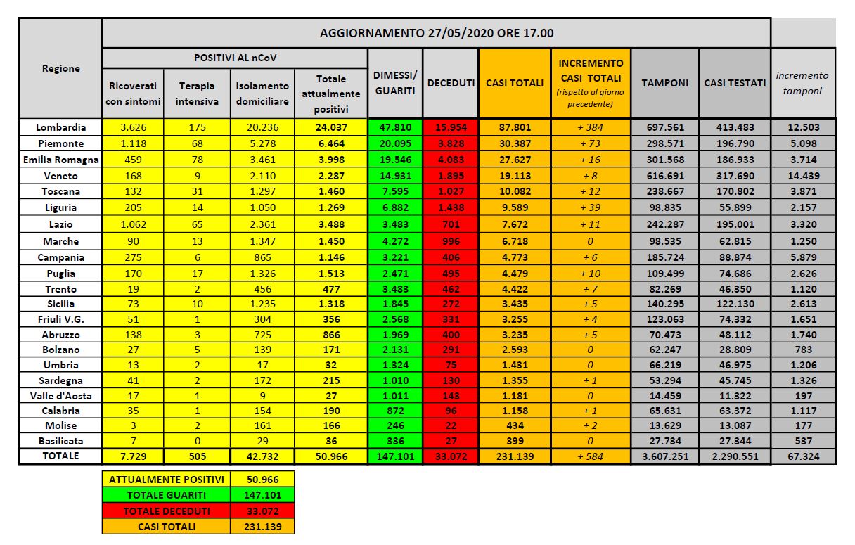 ROMA (ITALPRESS) – Al 27 maggio il totale delle persone che hanno contratto in Italia il coronavirus che causa il Covid-19 è di 231.139, con un incremento rispetto al 26 maggio di 584 nuovi casi.