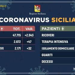 Coronavirus: l’aggiornamento in Sicilia, 2.171 positivi, 196 decessi, 305 guariti